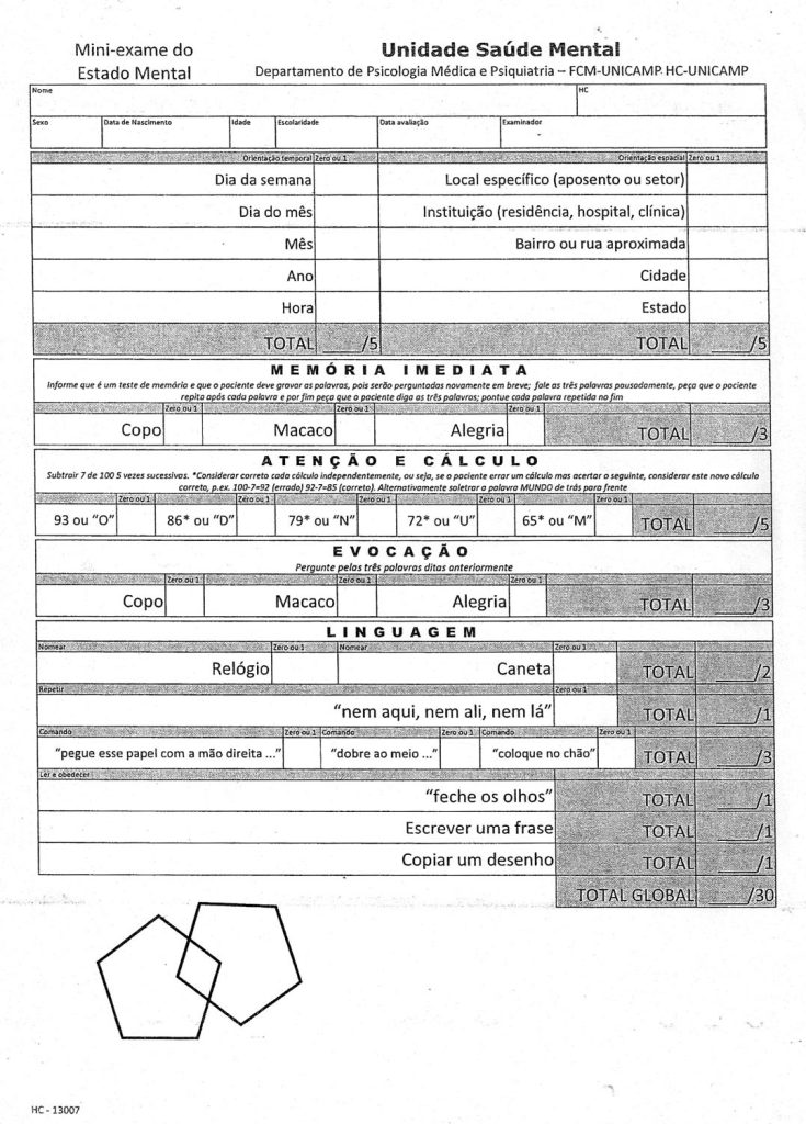 O mais usado, no contexto de minha pesquisa, é o Mini-exame do Estado Mental (ou Minimental, como os residentes referem). O teste se propõe a avaliar alguns domínios cognitivos, como orientação temporal e espacial, memória, atenção e cálculo, linguagem, raciocínio abstrato, planejamento. A pontuação máxima é de 30 pontos (ver figura 01).