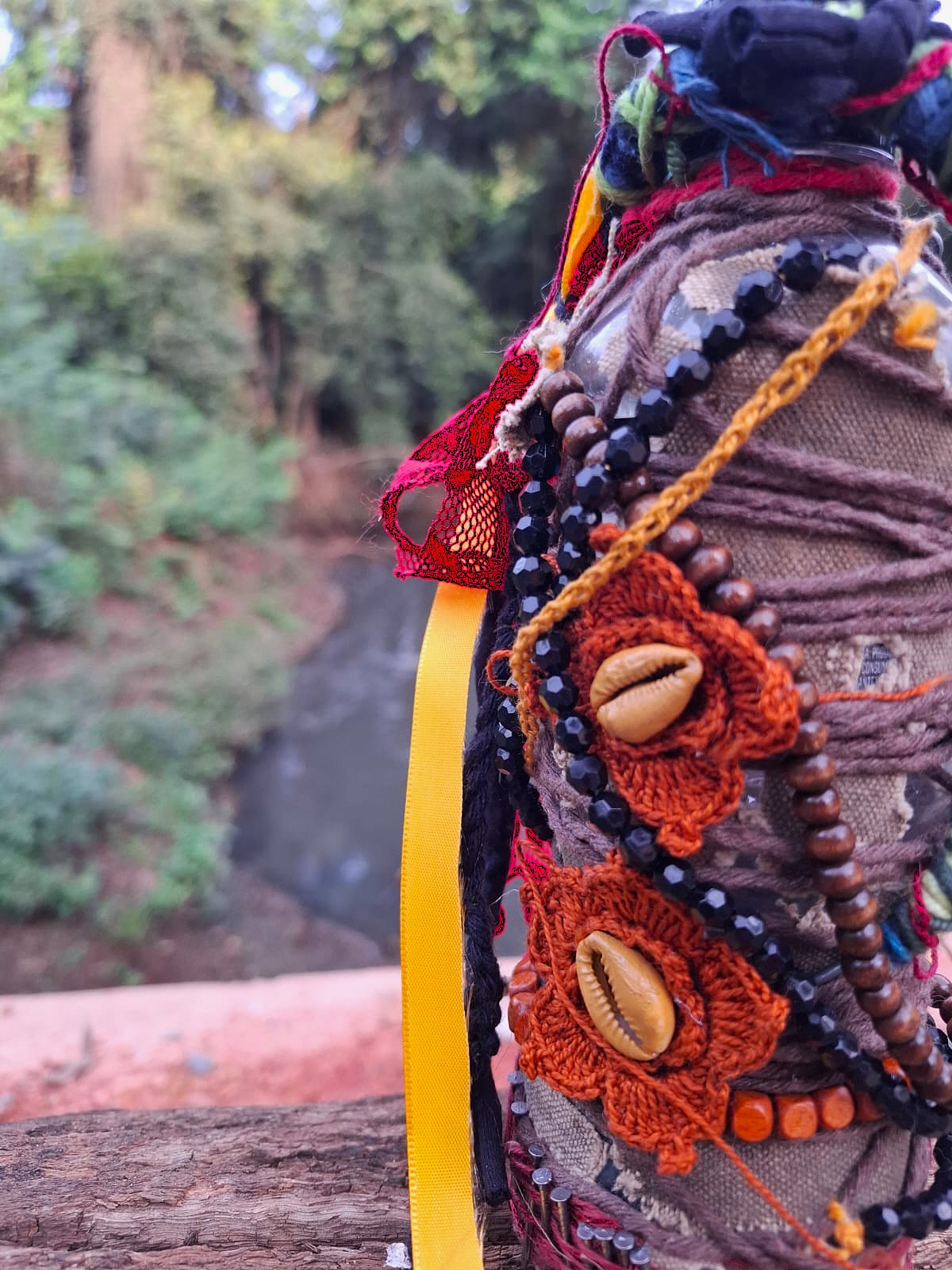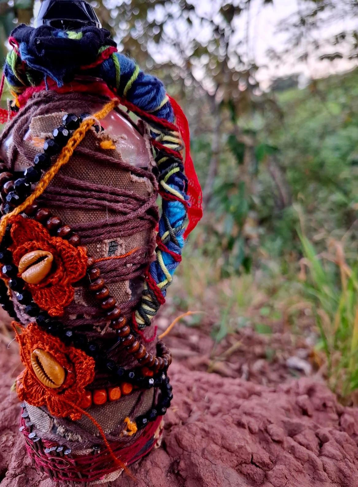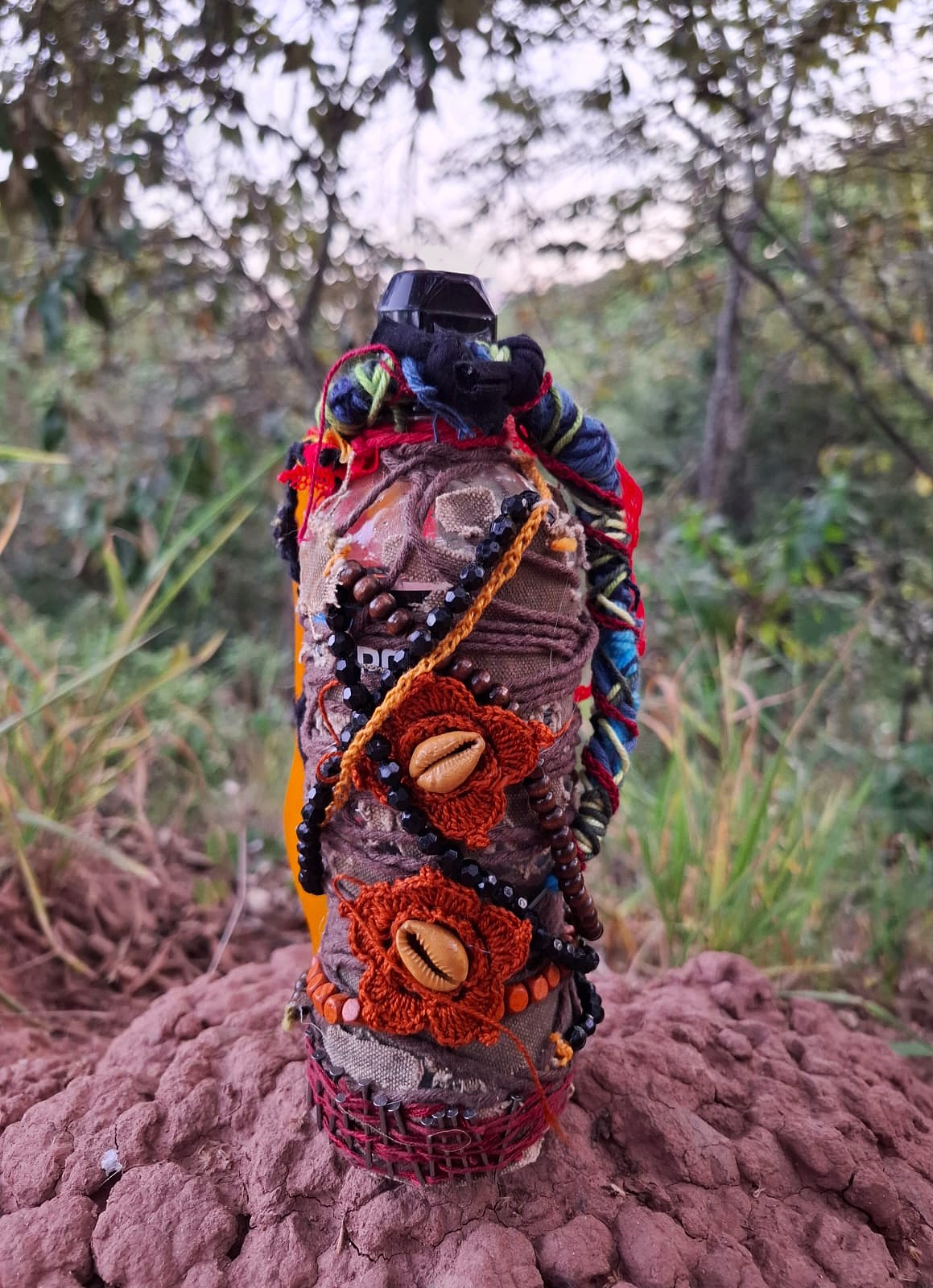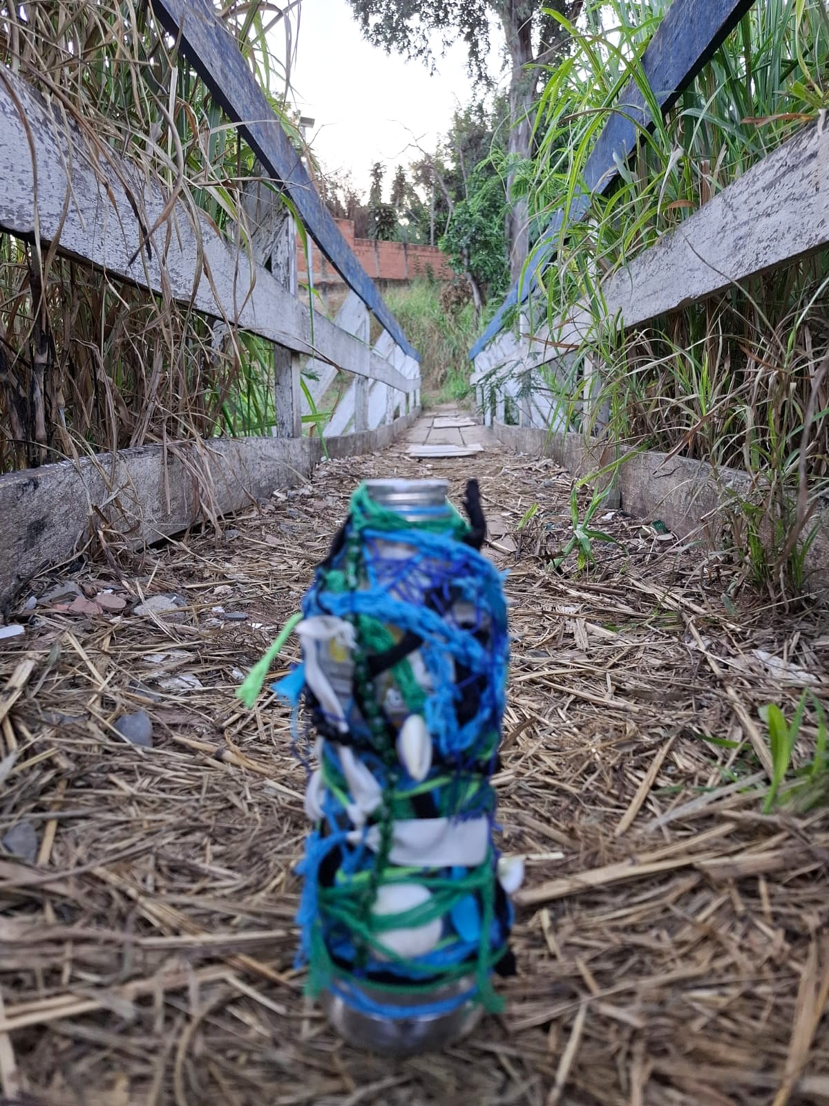 A proposta nasce de vivências pessoais em trilhas de bicicleta pela cidade de Limeira, SP. A paisagem entrelaça rios, pontes, poeira e caminhos que se abrem em um rizoma de direções, em meio a encruzilhadas líquidas, pontes que cruzam por cima dos rios. Os trajetos são sempre marcados pela presença incomoda e constante de garrafas PET e sacos plásticos descartados no percurso, o que trouxe uma inquietação seguida de um gesto: recolher esses restos e transformá-los em matérial para experimentações. A inspiração surgiu em conversas e na leitura do livro Pedagogia das Encruzilhadas, de Luiz Rufino, no grupo de estudos Multitão Labjor/Unicamp. Com o material em mãos, realizei intervenções nas garrafas, costurando-as, alinhavando linhas, tecidos, guias, conchas, fazendo amarrações e acúmulos, e deixando que Exu – senhor das encruzilhadas – atravessasse o processo. Afinal, “a encruzilhada é a boca do mundo, é saber praticado nas margens por inúmeros seres que fazem tecnologias e poéticas de espantar a escassez, abrindo caminhos. Exu, como dono da encruzilhada, é um primado ético que diz acerca de tudo que existe e pode vir a ser” (RUFINO, 2019, p. 4).