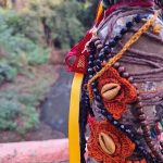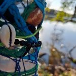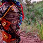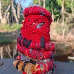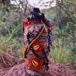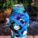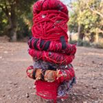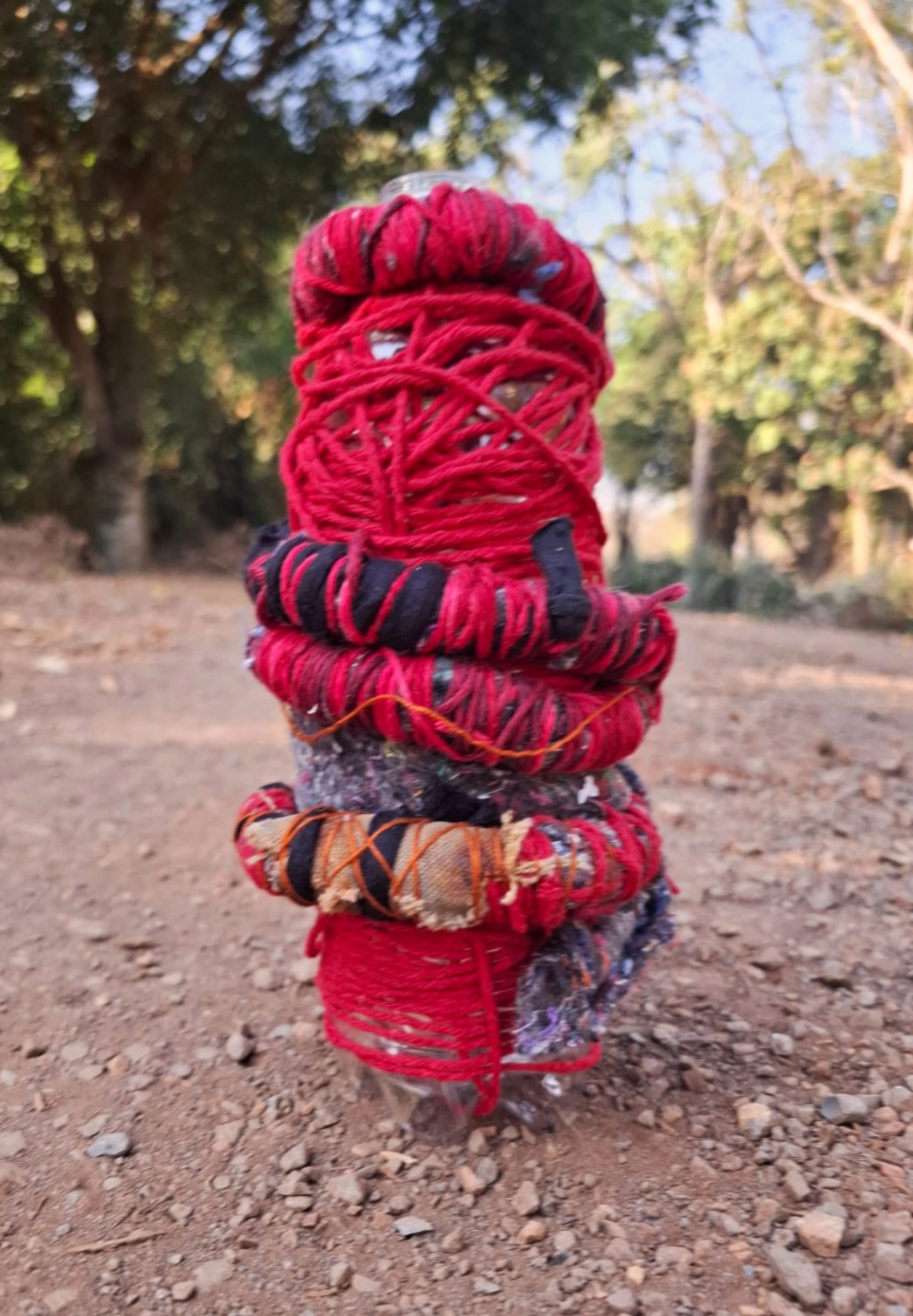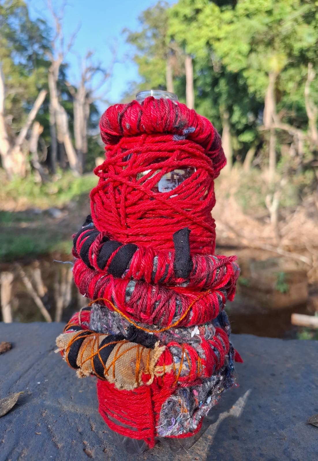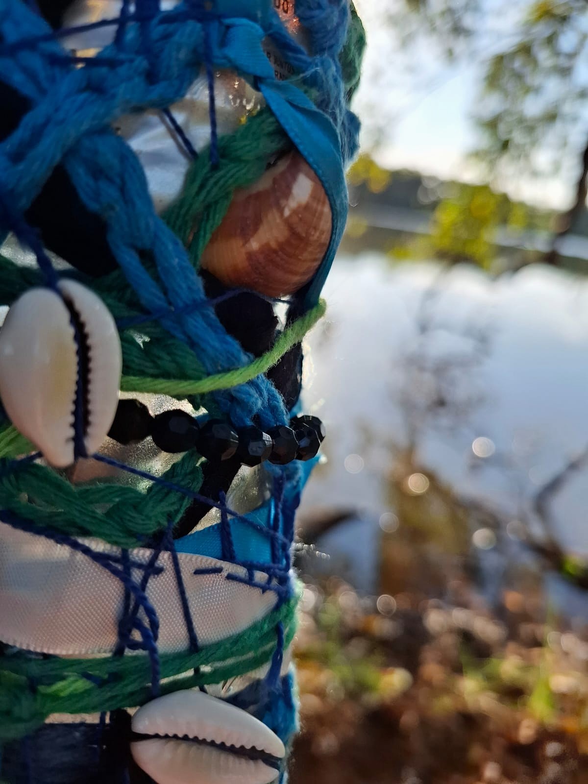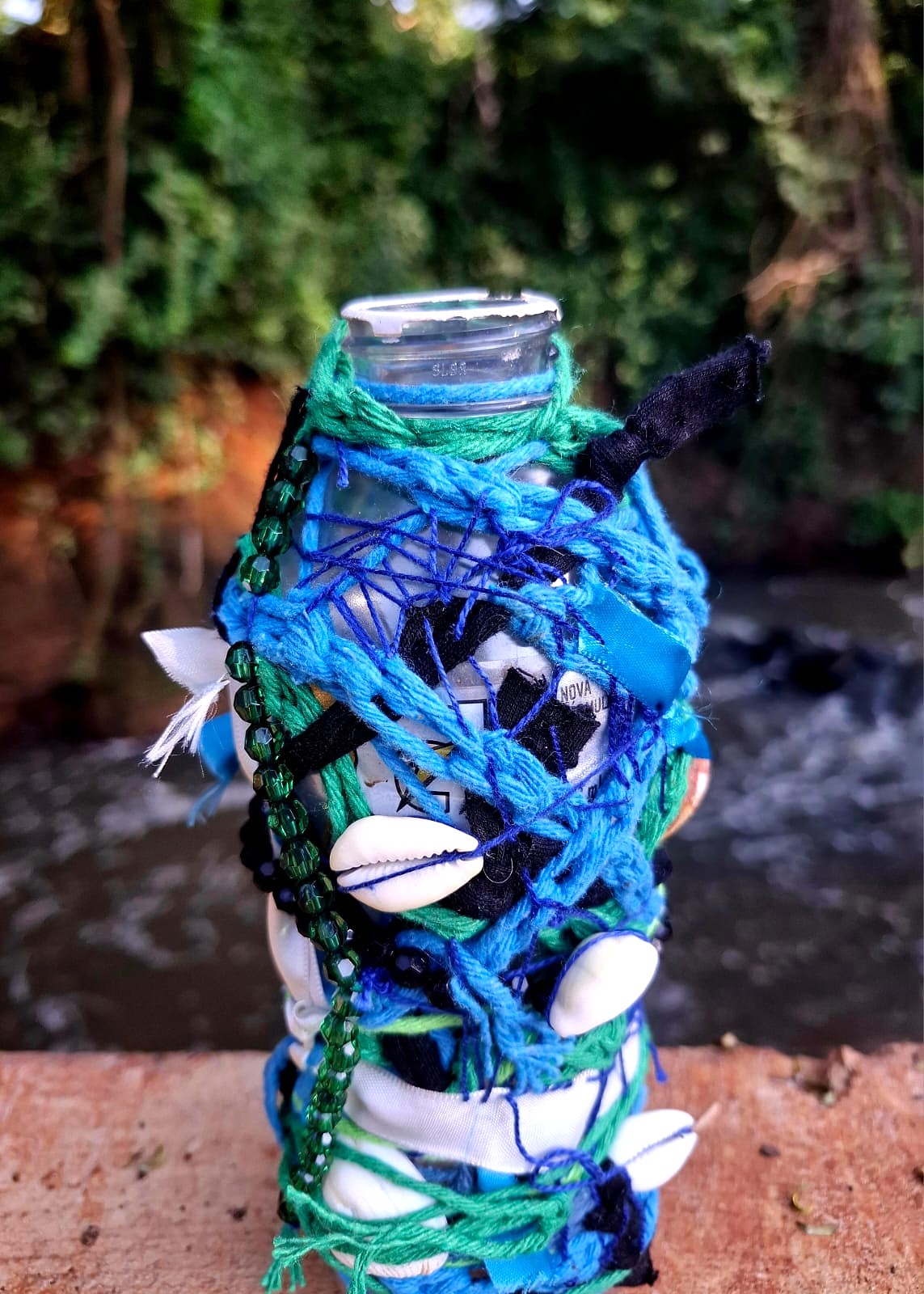 A proposta nasce de vivências pessoais em trilhas de bicicleta pela cidade de Limeira, SP. A paisagem entrelaça rios, pontes, poeira e caminhos que se abrem em um rizoma de direções, em meio a encruzilhadas líquidas, pontes que cruzam por cima dos rios. Os trajetos são sempre marcados pela presença incomoda e constante de garrafas PET e sacos plásticos descartados no percurso, o que trouxe uma inquietação seguida de um gesto: recolher esses restos e transformá-los em matérial para experimentações. A inspiração surgiu em conversas e na leitura do livro Pedagogia das Encruzilhadas, de Luiz Rufino, no grupo de estudos Multitão Labjor/Unicamp. Com o material em mãos, realizei intervenções nas garrafas, costurando-as, alinhavando linhas, tecidos, guias, conchas, fazendo amarrações e acúmulos, e deixando que Exu – senhor das encruzilhadas – atravessasse o processo. Afinal, “a encruzilhada é a boca do mundo, é saber praticado nas margens por inúmeros seres que fazem tecnologias e poéticas de espantar a escassez, abrindo caminhos. Exu, como dono da encruzilhada, é um primado ético que diz acerca de tudo que existe e pode vir a ser” (RUFINO, 2019, p. 4).