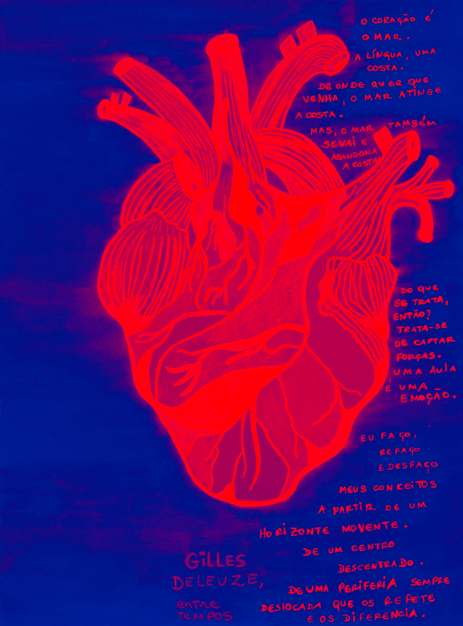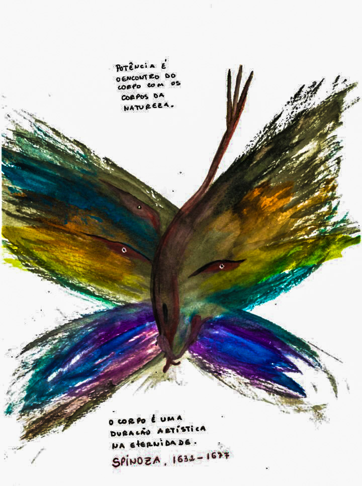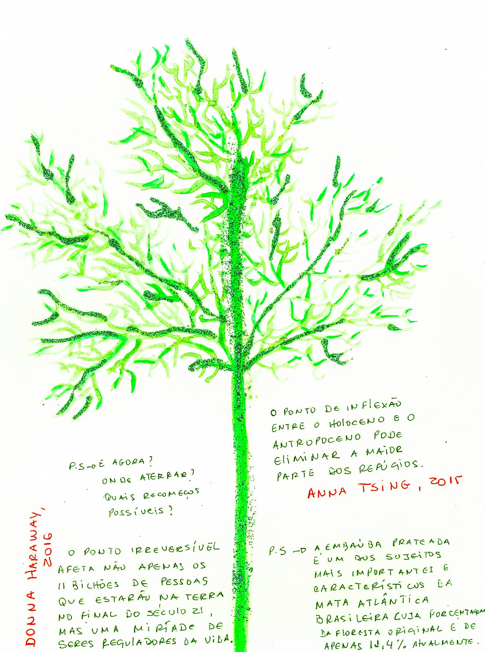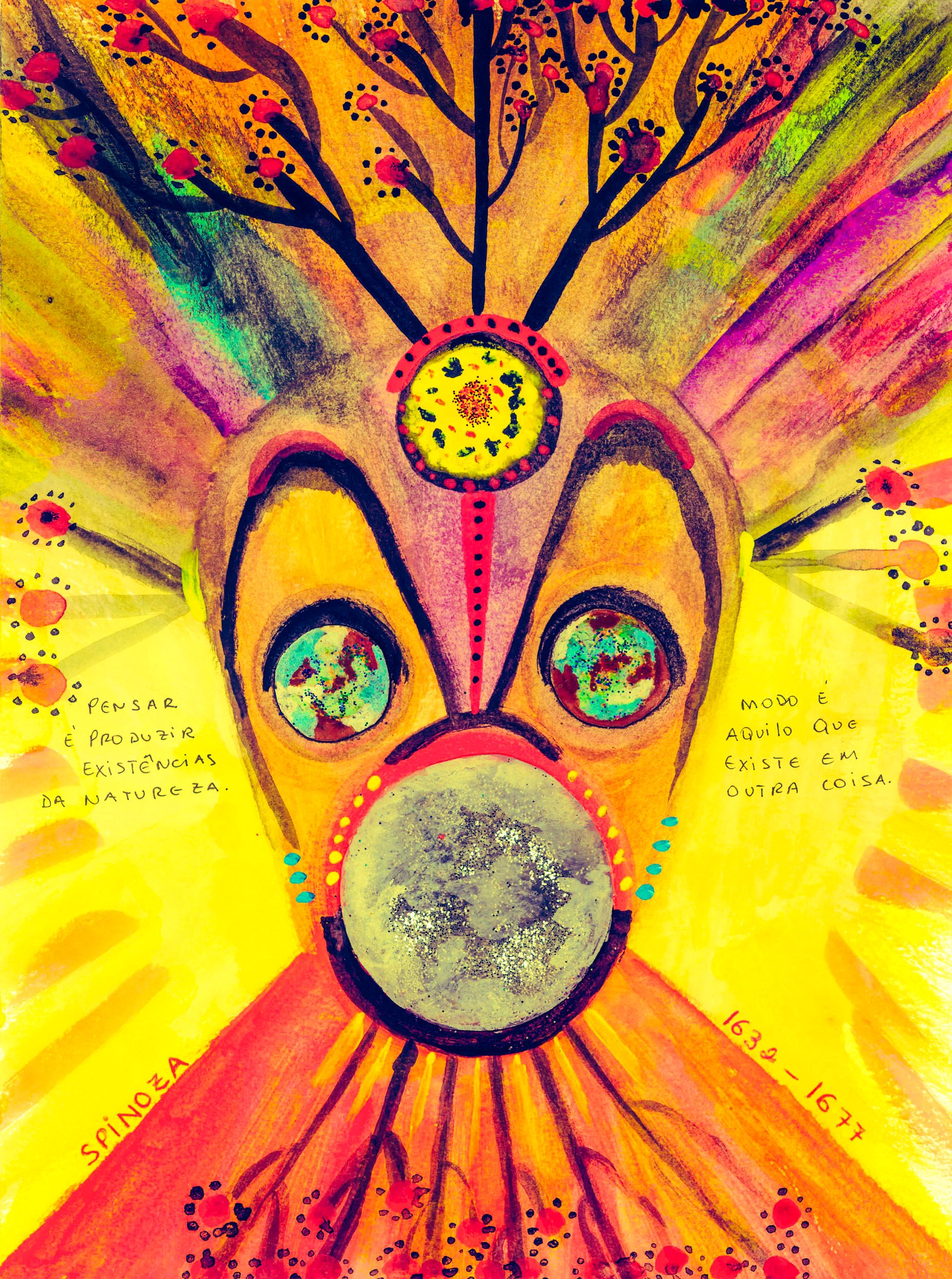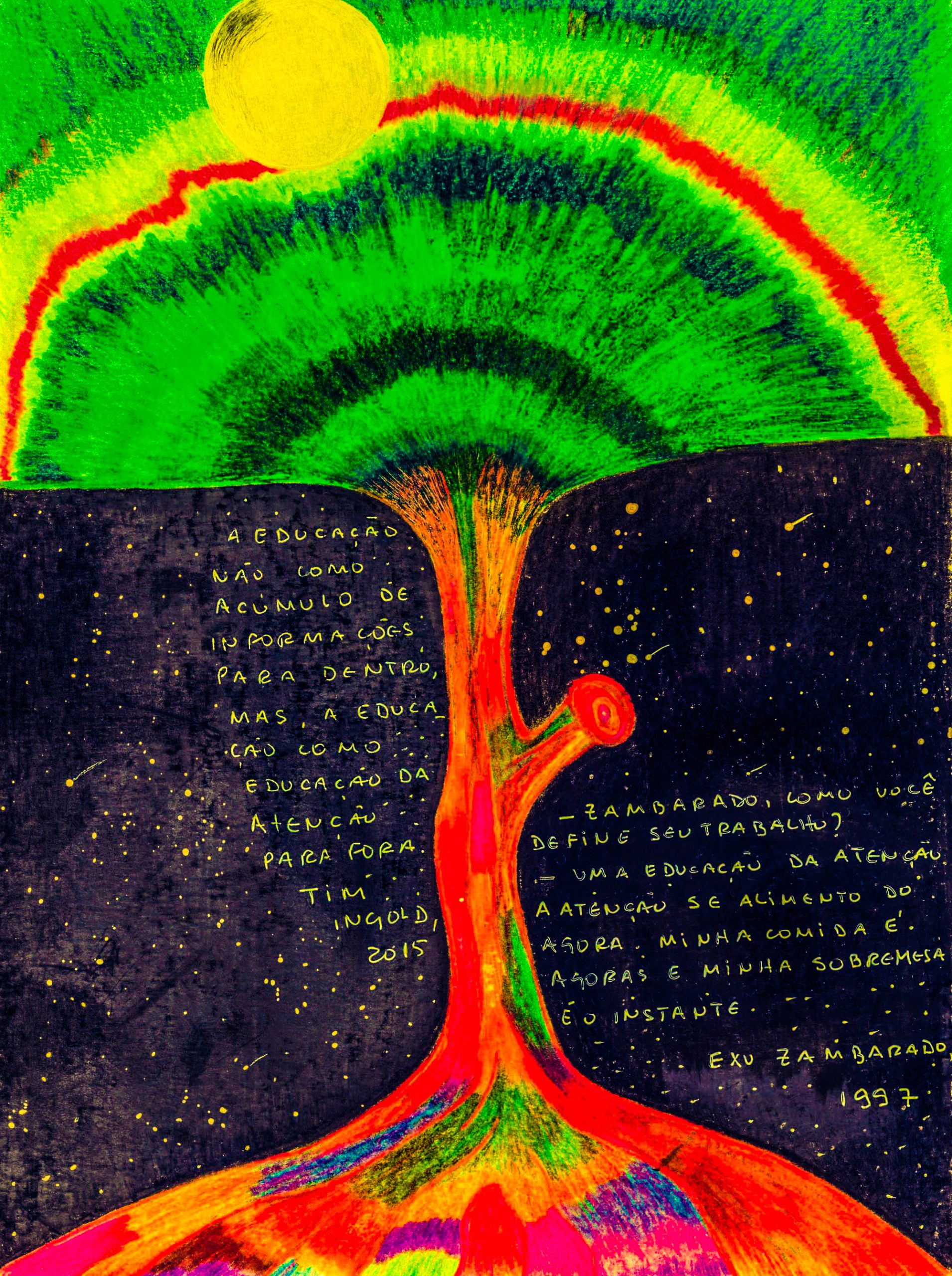 Os desenhos a seguir propõem uma consciência sem sujeito que vaza para fora dos limites da imagem e da linguagem: as formulações sobre a educação de Exu e Tim Ingold transitam pelas seivas das árvores, sob a luz prateada de uma lua cheia em aquário; o Exu Calunga da Calunga Grande está no meio do mar, com sua echarpe vermelha, chamando o vento; o Exu Zambarado escorre em palavras na vertical que, para serem apreciadas, movimentam a imagem, expandindo ainda mais a cena; Spinoza é um ciborgue deleuzeano vazado no crânio, soprando tudo o que pode um corpo no mundo; Donna Haraway faz parente com Ana Tsing e são, respectivamente, coruja e águia empoleiradas nos galhos coloidais da embaúba-posta-restante-da-mata-atlântica-brasileira para avisar aos humanos que o tempo das catástrofes climáticas já está entre nós.