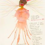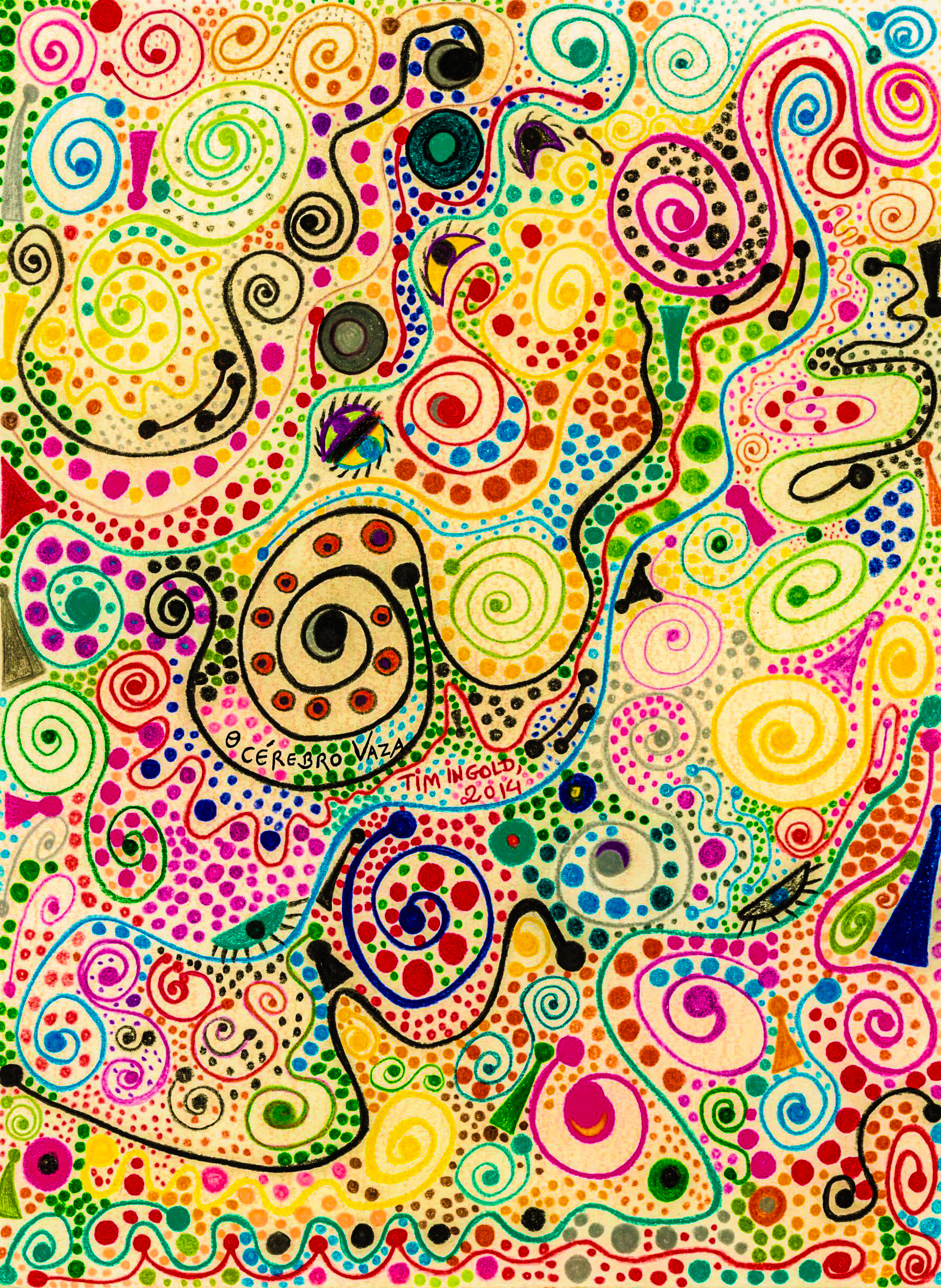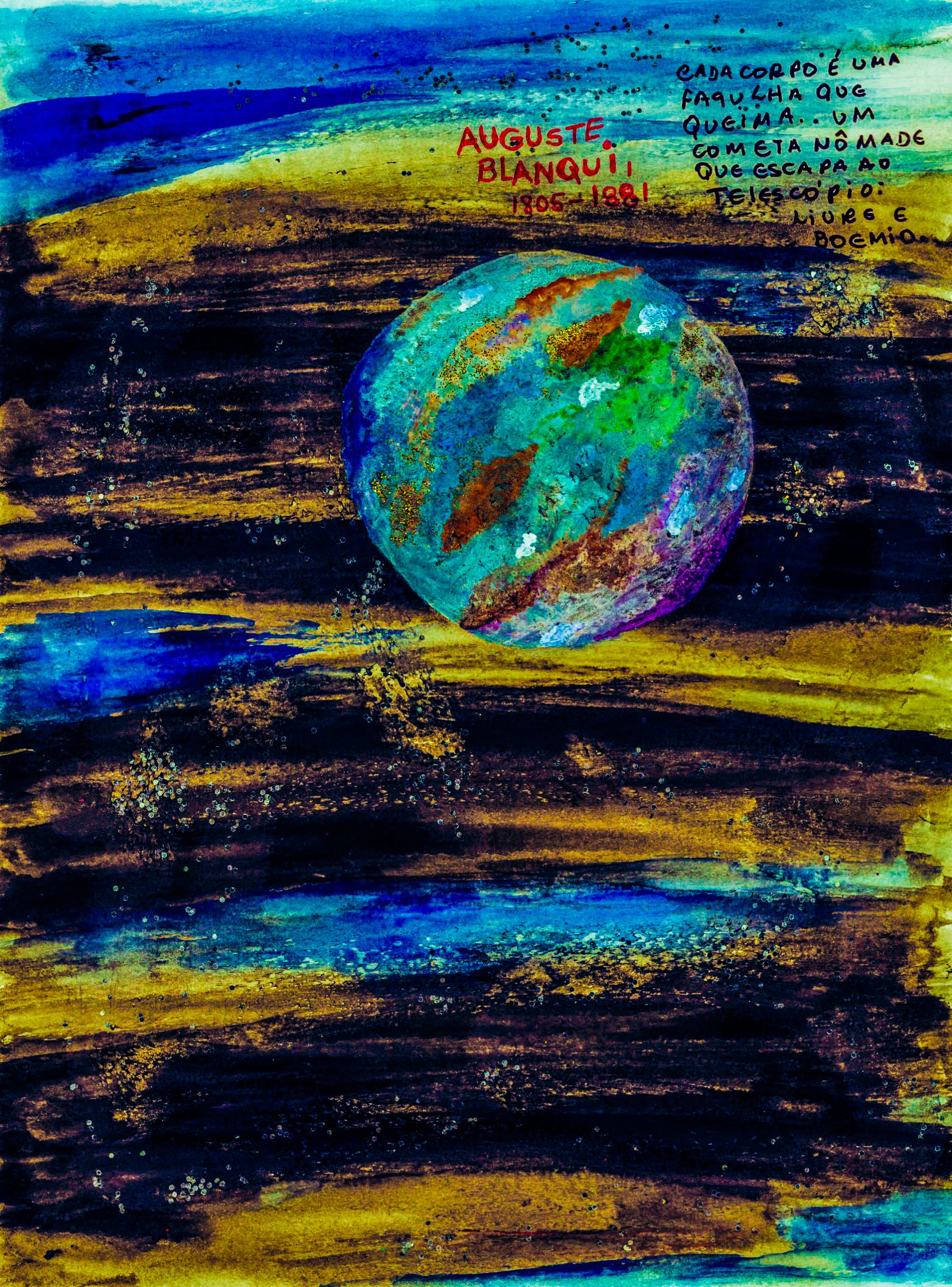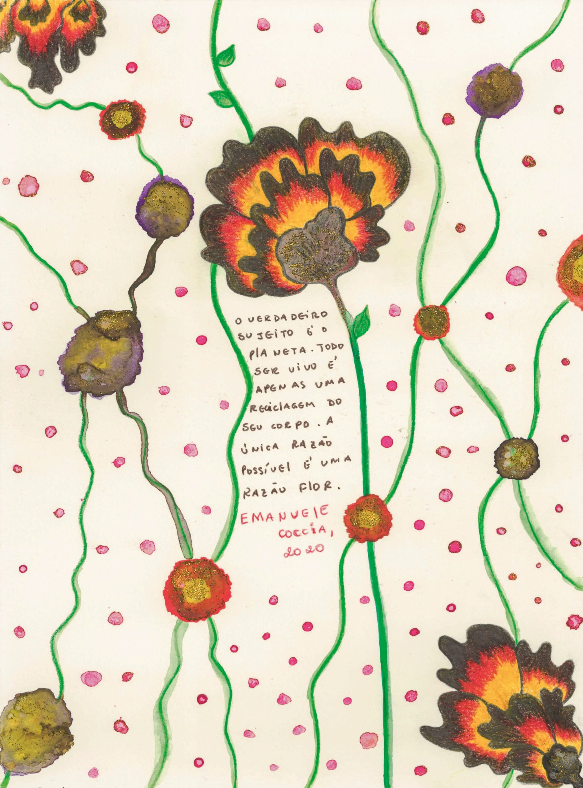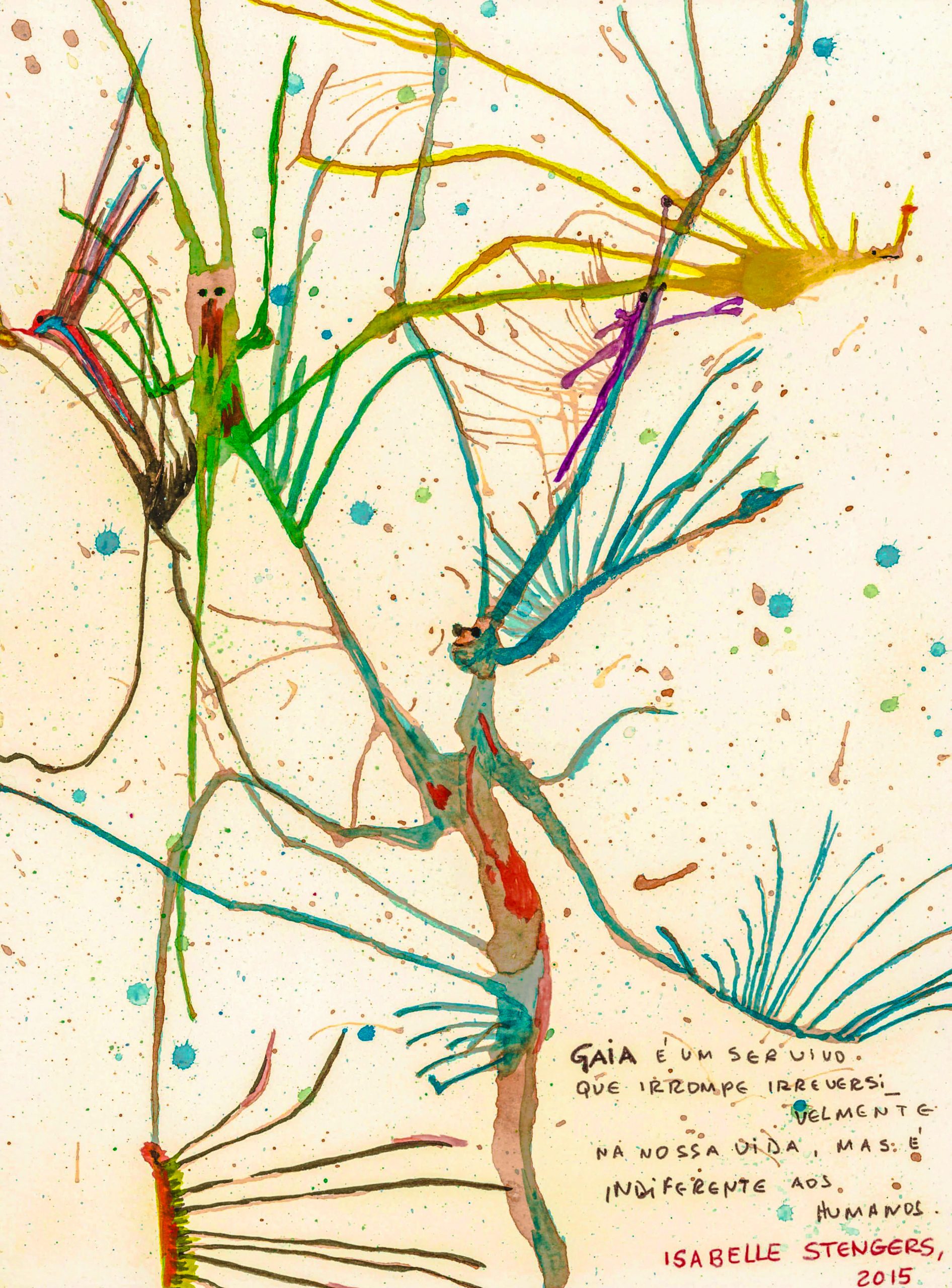 Os desenhos a seguir propõem uma consciência sem sujeito que vaza para fora dos limites da imagem e da linguagem: as formulações sobre a educação de Exu e Tim Ingold transitam pelas seivas das árvores, sob a luz prateada de uma lua cheia em aquário; o Exu Calunga da Calunga Grande está no meio do mar, com sua echarpe vermelha, chamando o vento; o Exu Zambarado escorre em palavras na vertical que, para serem apreciadas, movimentam a imagem, expandindo ainda mais a cena; Spinoza é um ciborgue deleuzeano vazado no crânio, soprando tudo o que pode um corpo no mundo; Donna Haraway faz parente com Ana Tsing e são, respectivamente, coruja e águia empoleiradas nos galhos coloidais da embaúba-posta-restante-da-mata-atlântica-brasileira para avisar aos humanos que o tempo das catástrofes climáticas já está entre nós.