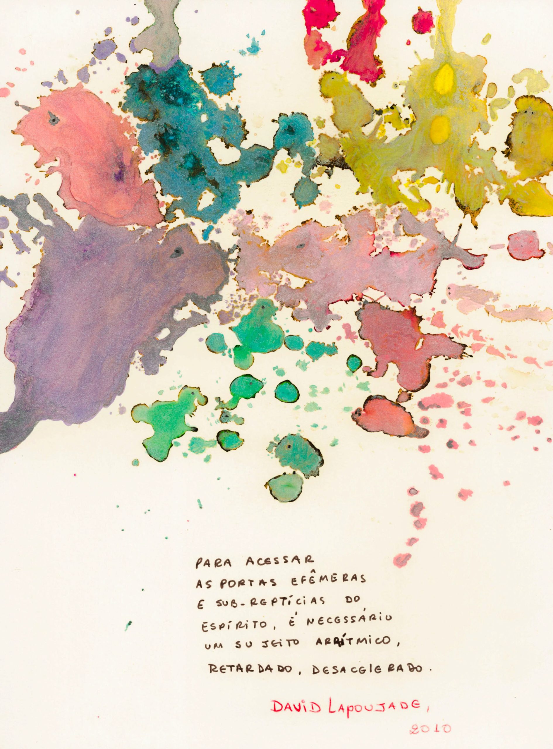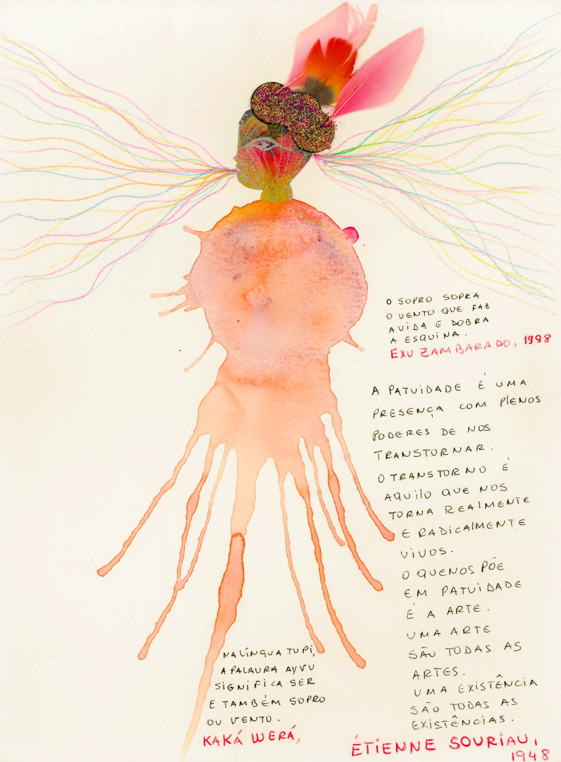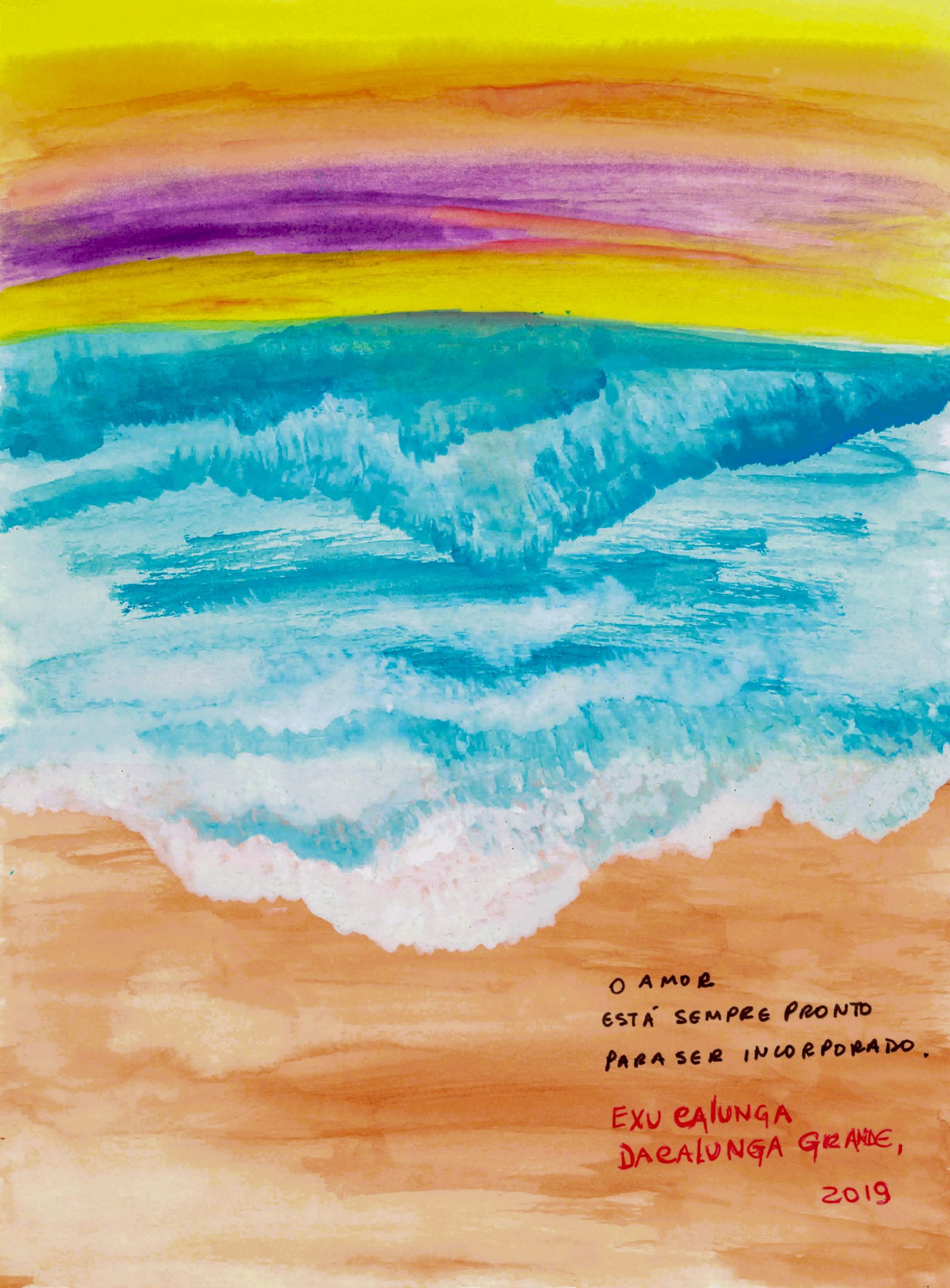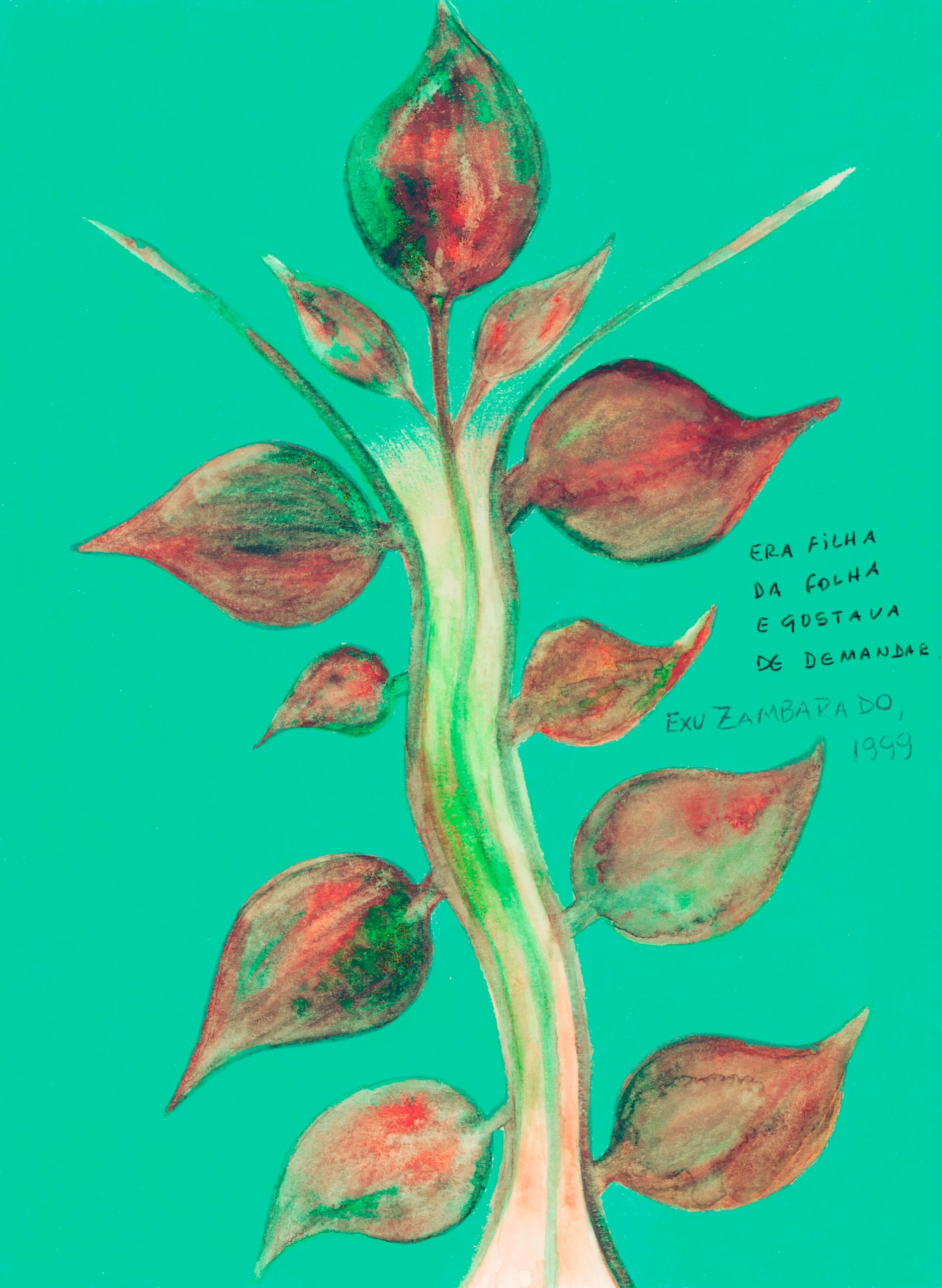 Exu é o xamã que movimenta devires e linhas de sonho para que modos de existência do corpo possam vir à tona, voar, cantar, escrever e ver o mundo com os olhos da canção, da poesia, do desenho e do que mais eles quiserem, para que as artes da existência, da presença, da alma, do corpo, da voz e das mãos possam, de fato, regenerar e curar. É isso que os Exus Zambarado, Calunga da Calunga Grande e Zé Pelintra, e os Encantados Sete Folhas, Bom Floral e Rã Azul, estão fazendo: agenciando a arte como espírito que tem agência: agência de regeneração e cura. Eles parecem apostar numa espécie de batalha estética entre singularidades, na qual o xamã da arte e a arte do xamã vão livrando o corpo da ação predatória da representação e da imitação que movem o artista ocidental.