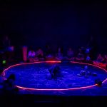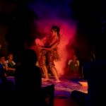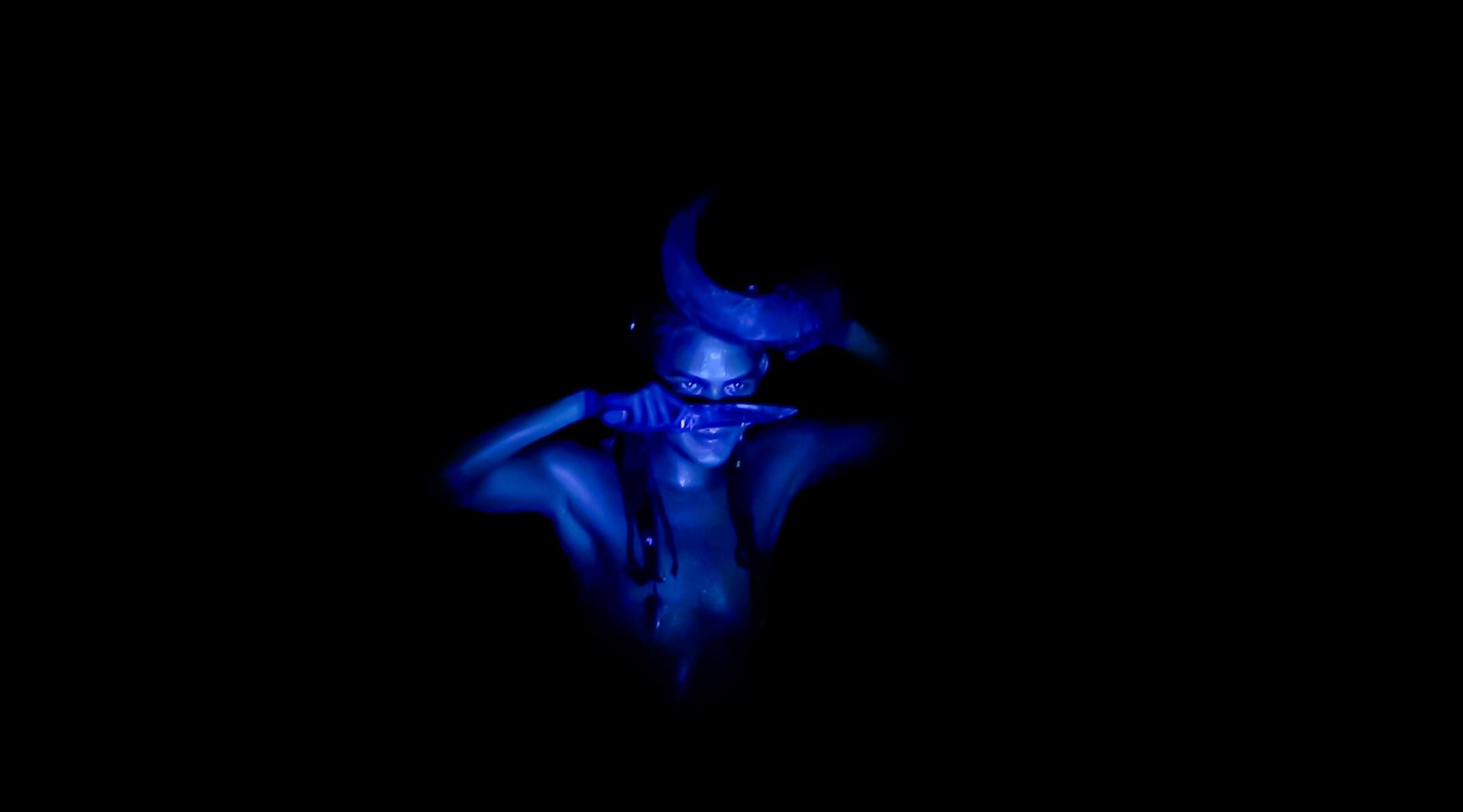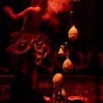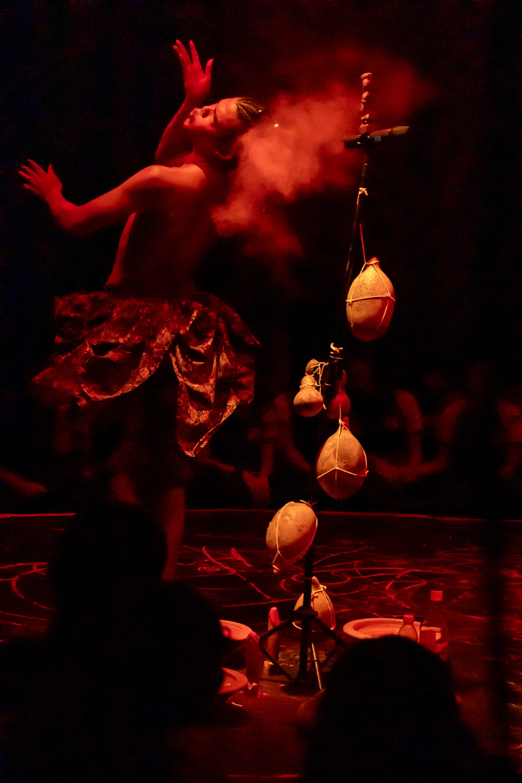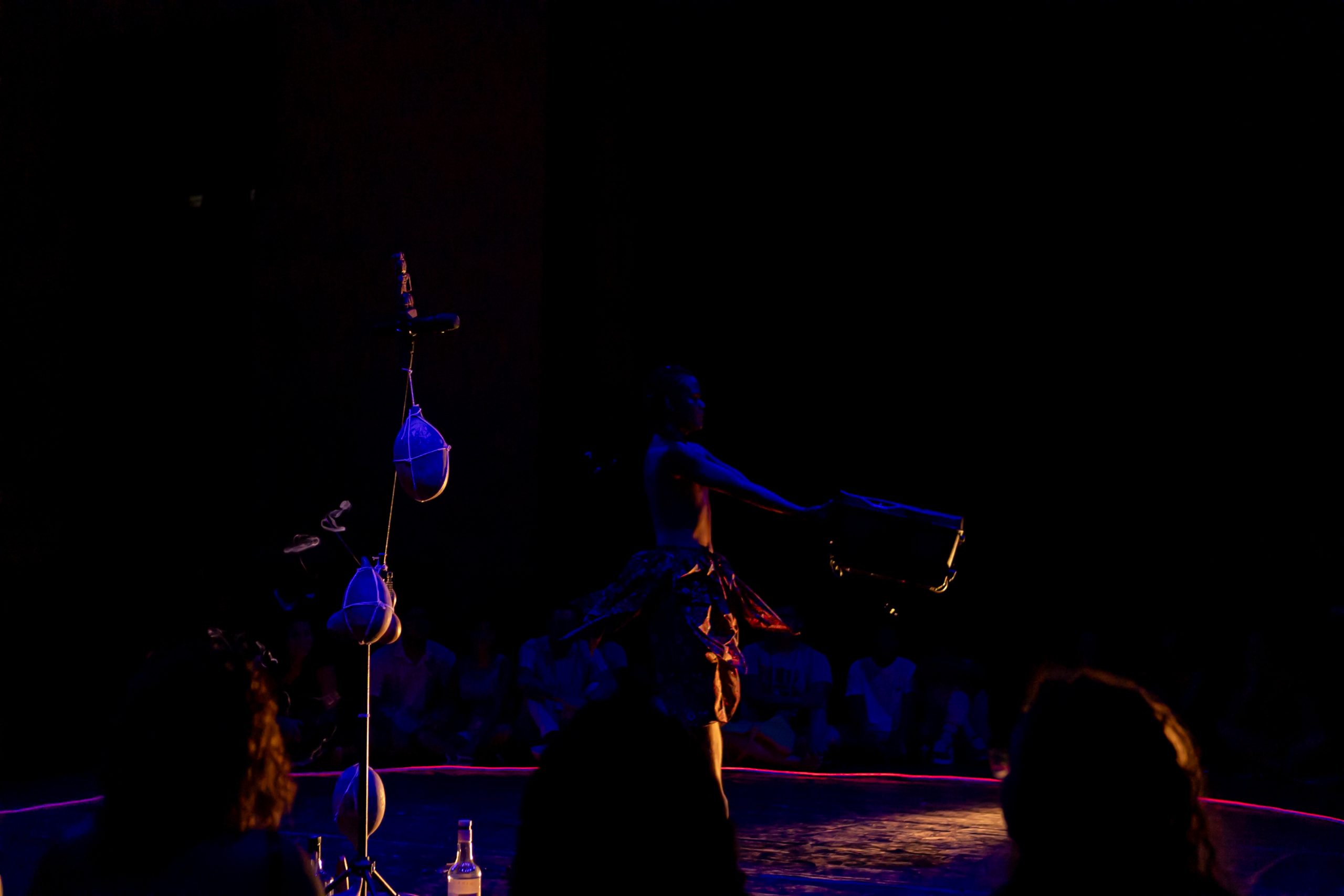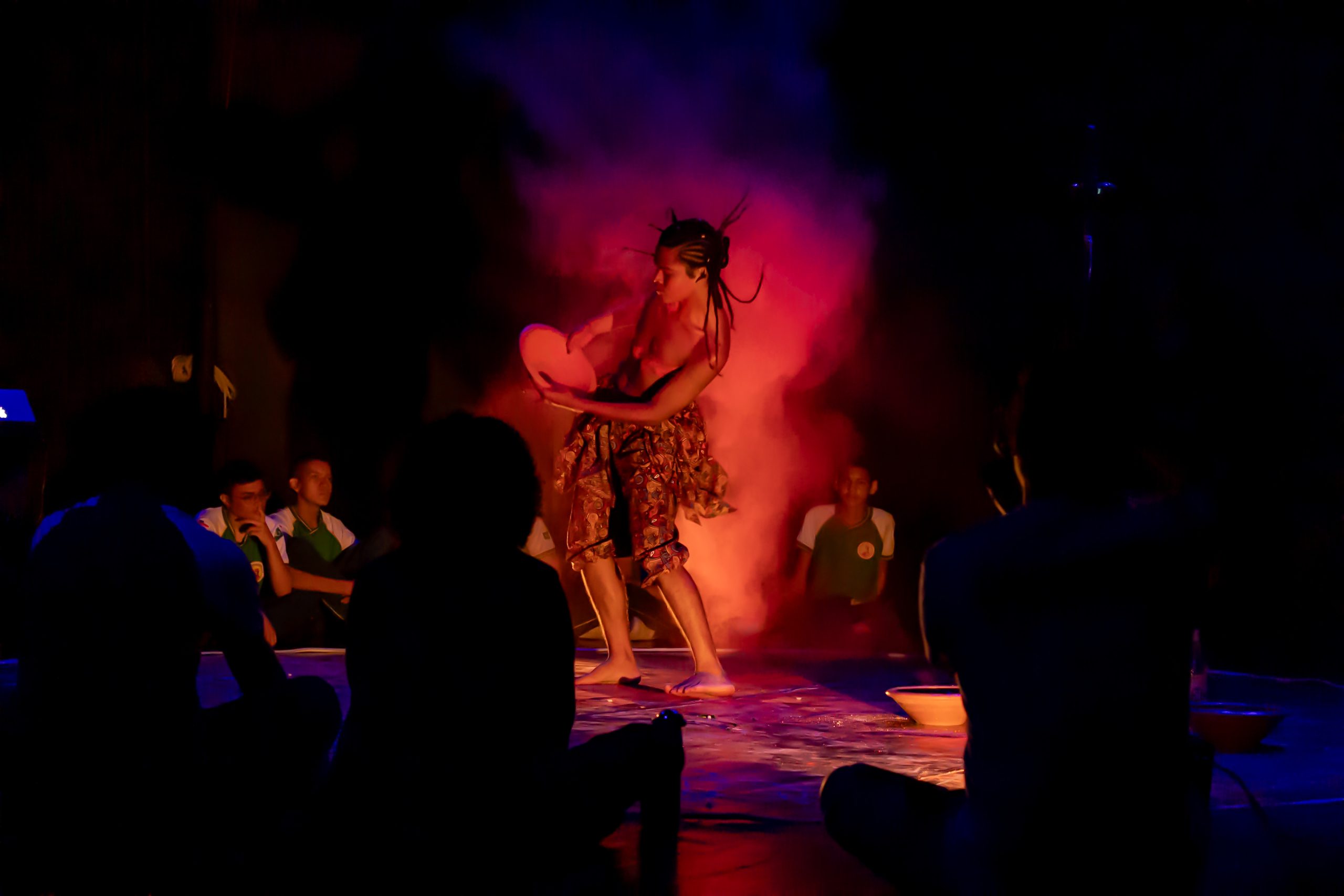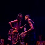 A aparição “Mojubá” é uma pesquisa cênico-performativa iniciada no ano de 2021 (durante a pandemia de Covid-19) como pesquisa de iniciação científica no curso de Licenciatura em Teatro. Em um processo exulístico, a obra comeu de muitos ebós, foi tecida por várias mãos, caminhou por diversas terras e se transmutou em diversasfaces, o seu caminho de criação envolveu a vivência com entidades de Exús e Pombas-gira no terreiro da autora – o Recanto de Preta Mina Ilê de Iansã (Manaus/AM) – onde germinaram escritas performativas que foram expostas em cartazes lambe-lambe por encruzilhadas do centro da capital amazonense em zonas de bohemia, de comércio, de prostituição e regiões portuárias, espaços os quais para os povos de terreiros são campos de força dessas entidades. Com as obras entregues para as ruas, a pesquisa se encaminhou para o corpo e para o palco, com a criação de uma cena curta de 5 minutos, onde foram organizados como dramaturgia pontos-cantados e as músicas “Exú nas escolas” de Elza Soares e “Exú” de Serena Assumpção, a obra foi apresentada na 5o edição do Festival 5 Minutos em Cena – outros caminhos em 2022 (Panorando Produções) no palco do Teatro Amazonas e em duas escolas públicas dos municípios de Manacapuru e Iranduba para alunos do ensino fundamental e médio. Em 2024, com apoio da Lei Paulo Gustavo, o trabalho se expandiu para novas cabeças em intercâmbio com artistas negros do Amazonas de outras regiões do Brasil que foram referências para a obra: na dramaturgia Kelsson Succi (RJ), na preparação corporal de Kanzelu Muka (SP/DF) e o Coletivo das Liliths (BA), além do elenco da Café Preto Produções Artísticas (AM) em cena Correnteza Braba, Paulo Martins, Marcelo Rosa, Ana Paula Mady e Enos Lopes. A obra é uma gira aberta às experimentações, contradições, gingas e estados alterados de consciência como bem nos ensina Exú. O som percussivo e orgânico se encruzilha com o PC music das gravações e captações ao vivo; a iluminação joga no palco com o corpo da atriz e compõe o cenário com a mesa de luz em cena; o texto é regurgitado e há improvisações e diálogos com a platéia, os objetos cênicos são criados ao longo do espetáculo e possuem aromas e texturas. “Mojubá” é a saudação a Exú, essa obra é uma demarcação do território Amazônico como um espaço também pertencente a estes encantados. A Amazônia também é morada de Exú, Exú também ginga pela vida dessa terra.