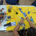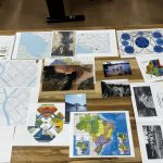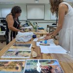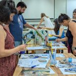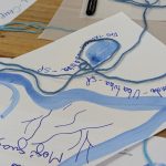 Como criar alianças com as águas em processos de pesquisa e criação artística? Como tornar as águas companhias efetivas de pensamento e modos de existir dentro da universidade? A primeira “Mesa de trabalho com as águas”, que o grupo multiTÃO realizou em 2025, mais precisamente no dia 24 de março, movimentou essas perguntas. As mesas de trabalho já haviam sido feitas antes pelo grupo com as nuvens, os sapos, os pássaros, os vírus, as plantas… e, desta vez, nos encontramos com as águas. O encontro aconteceu online e presencial no Labjor-Unicamp. As artistas Mariana Vilela e Valéria Scornanienchi trouxeram propostas e materiais para iniciarmos os movimentos de coleta e experimentação. Mariana pediu que trouxéssemos uma garrafa pet coletada da rua – ressaltando que era muito importante que esta fosse realmente coletada nas ruas e que estivesse no chão -, uma foto nossa com o mar ou rio para fazer intervenções e que pesquisássemos os rios que estavam perto de nossas casas. Já Valéria trouxe uma proposta de bordado coletivo que ela já tem experimentado em vários outros espaços e nos convidou a bordar um manto das águas. Além das garrafas, fotografias impressas em acetato e papel, linhas, agulhas e tecido, também vieram para a mesa: mapas e diagramas de pesquisas realizadas no projeto INCT Onseadapta e imagens de divindades das águas, que Marcela Perpétuo trouxe; contas de água, que Fernando Camargo levou; o livro objeto Ri(s)o <https://climacom.mudancasclimaticas.net.br/livro-riso/>, levado por Susana Dias; criações com madeiras coletadas na praia da Vila Joanes pelo artista Lupa Jacob, trazidas por Valéria Scornaienchi. Nas suas casas, quem participou online, também trouxe outras materialidades para a mesa. Durante uma tarde, o grupo lidou com esses materiais criando interseções entre eles, aprendendo a se relacionar com materiais hipercomplexos como o plástico, ensaiando pinturas, desenhos, bordados, performances que ativassem a força das águas. A mesa inundou a sala e deixou os corpos cheios de novas possibilidades: criar uma cartela de cores das águas, instaurar uma bacia hidrográfica fabulada que reúna diferentes corpos d’água, trazer plantas para a mesa e compor com elas, trabalhar com as águas em contextos situados, realizar a mesa à beira d’água, criando conexões com rios mais próximos da universidade… Sentimos como as águas nos convocam para outros encontros…