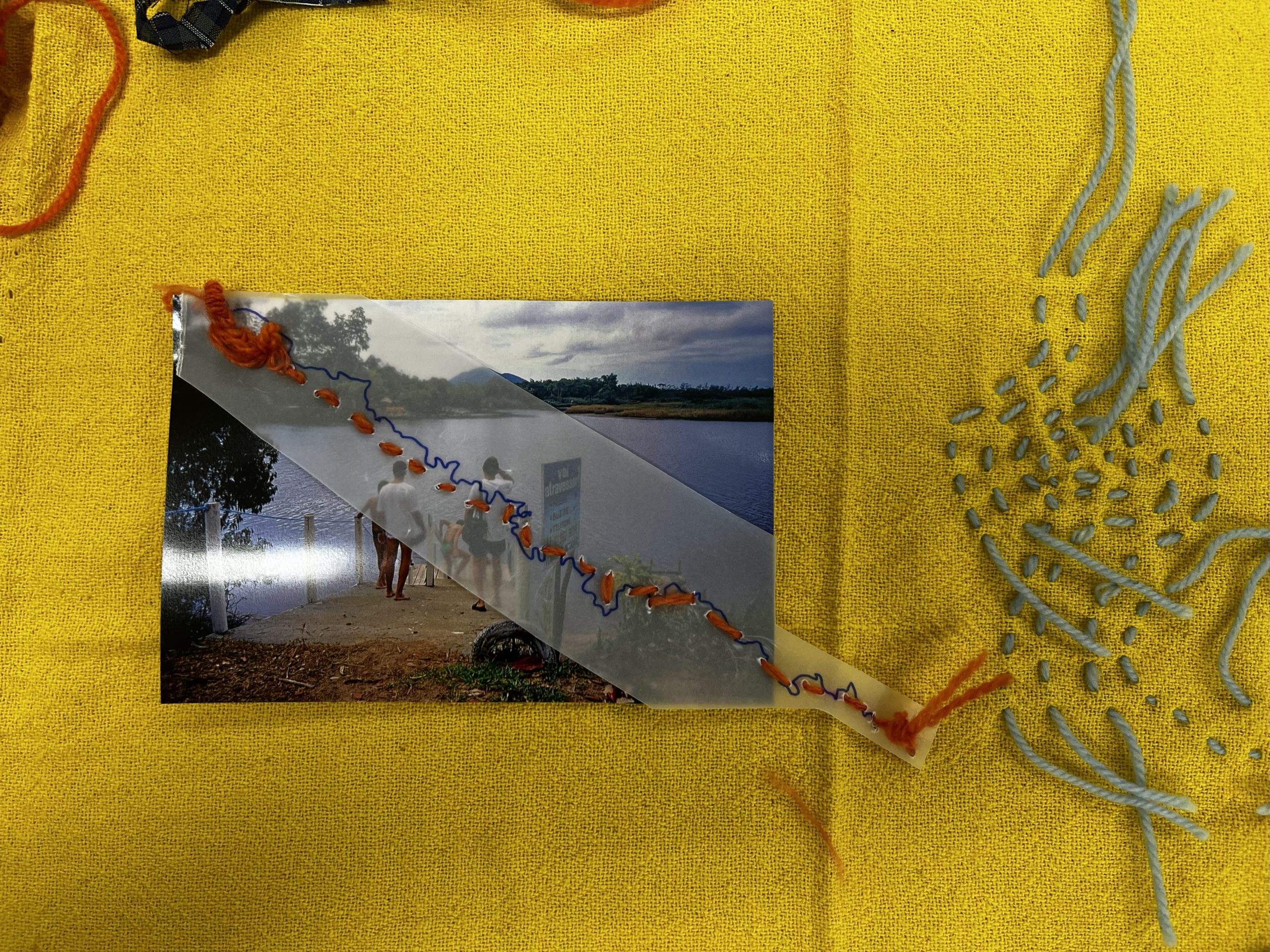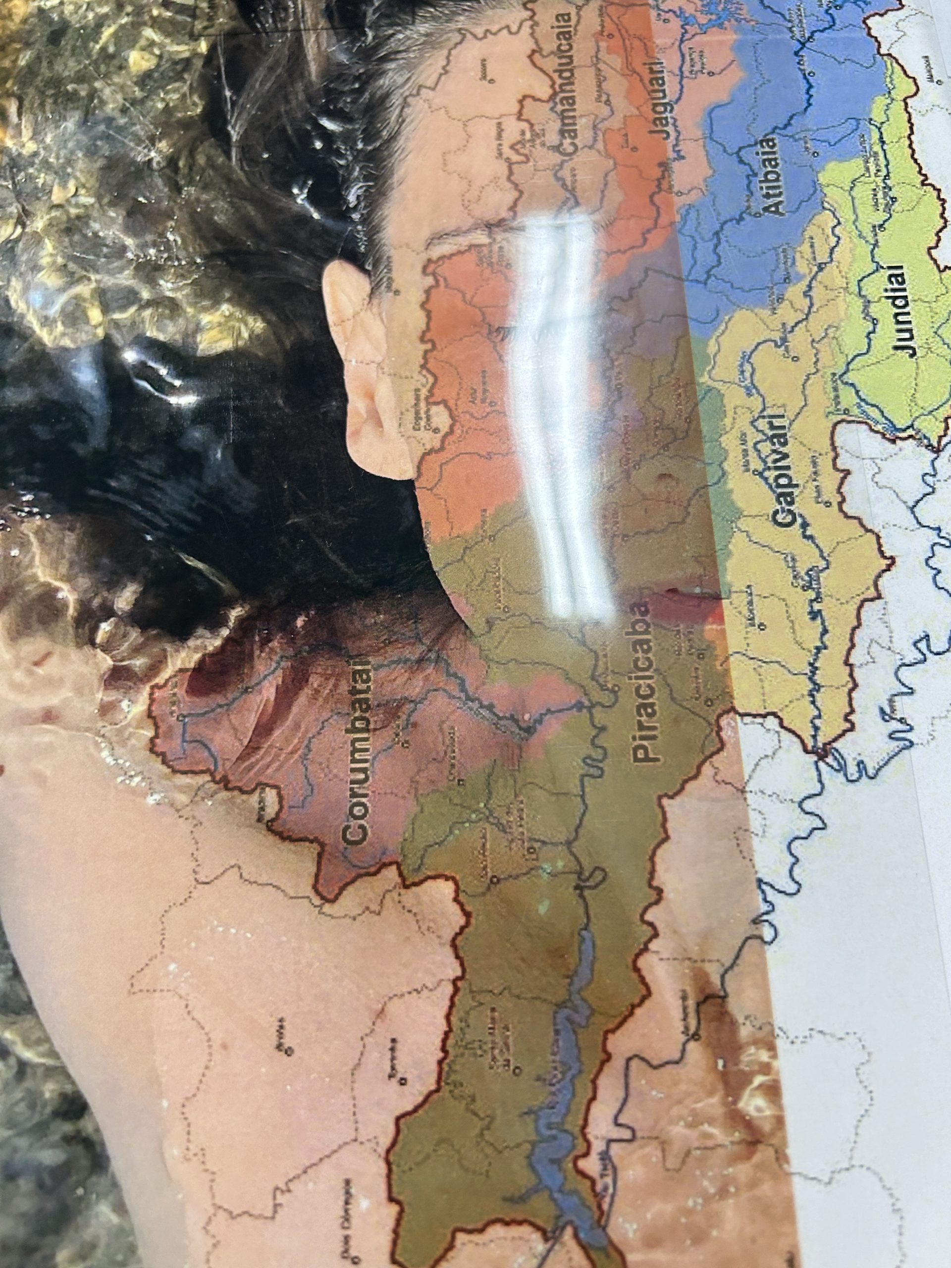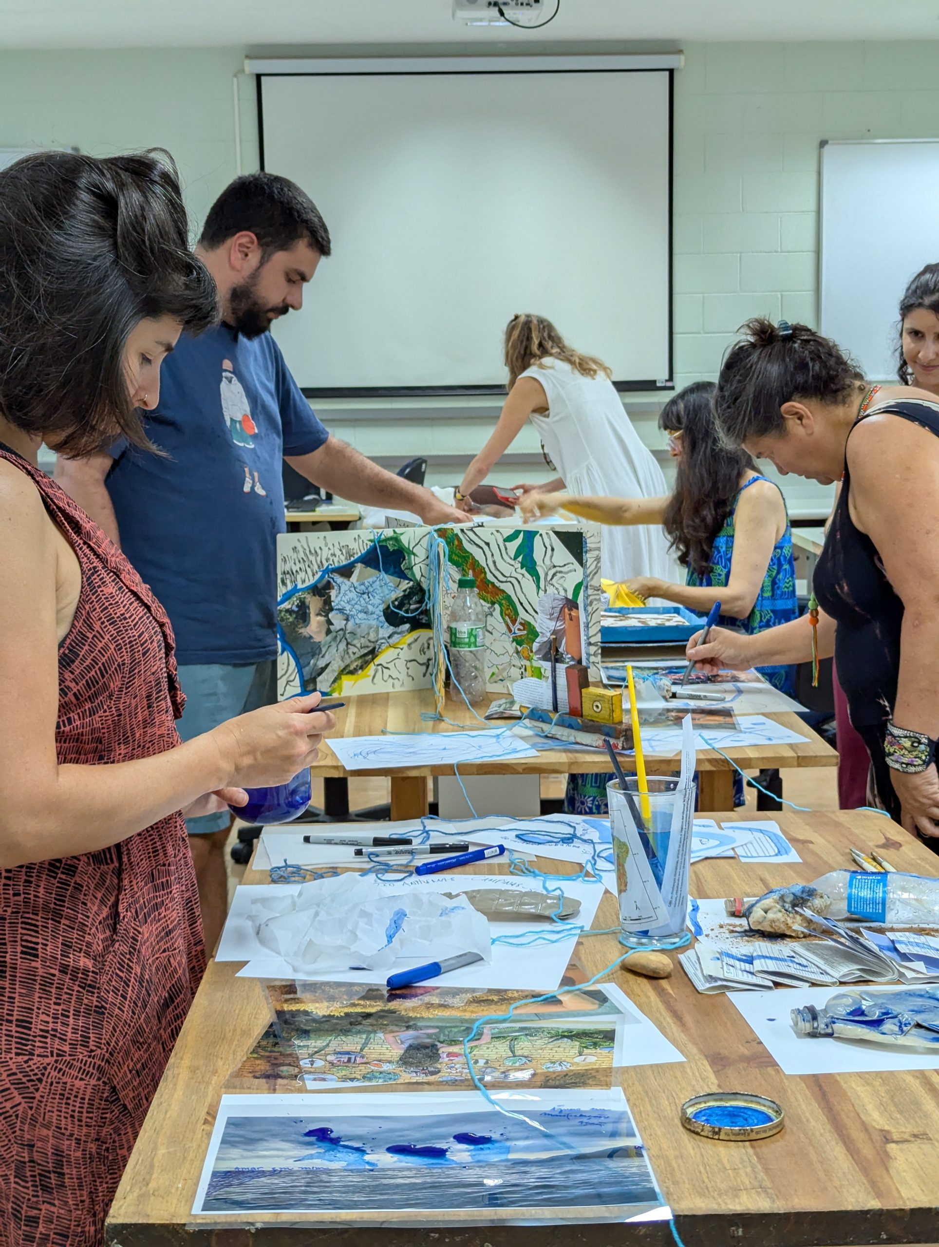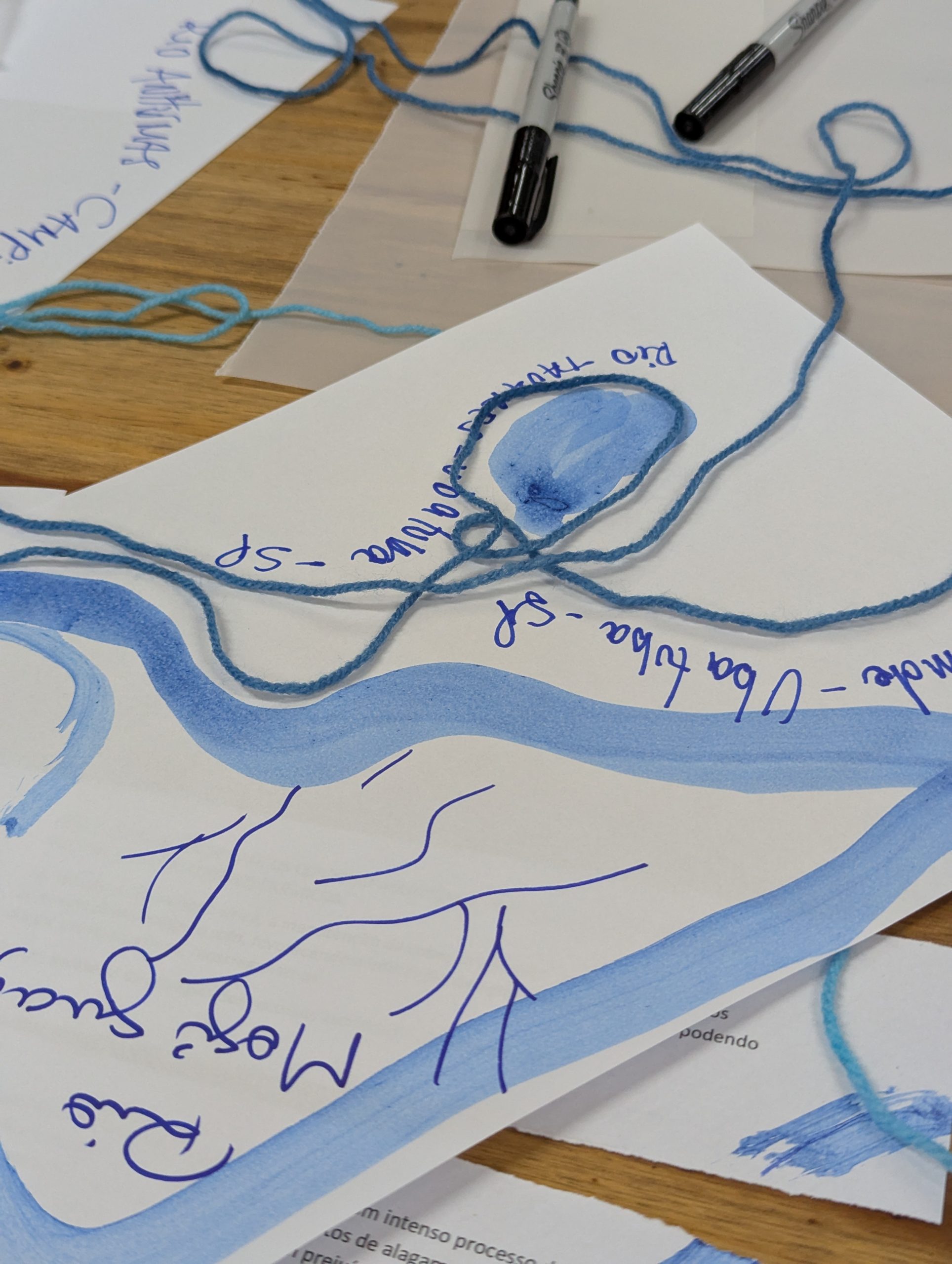 Como criar alianças com as águas em processos de pesquisa e criação artística? Como tornar as águas companhias efetivas de pensamento e modos de existir dentro da universidade? A primeira “Mesa de trabalho com as águas”, que o grupo multiTÃO realizou em 2025, mais precisamente no dia 24 de março, movimentou essas perguntas. As mesas de trabalho já haviam sido feitas antes pelo grupo com as nuvens, os sapos, os pássaros, os vírus, as plantas… e, desta vez, nos encontramos com as águas. O encontro aconteceu online e presencial no Labjor-Unicamp. As artistas Mariana Vilela e Valéria Scornanienchi trouxeram propostas e materiais para iniciarmos os movimentos de coleta e experimentação. Mariana pediu que trouxéssemos uma garrafa pet coletada da rua – ressaltando que era muito importante que esta fosse realmente coletada nas ruas e que estivesse no chão -, uma foto nossa com o mar ou rio para fazer intervenções e que pesquisássemos os rios que estavam perto de nossas casas. Já Valéria trouxe uma proposta de bordado coletivo que ela já tem experimentado em vários outros espaços e nos convidou a bordar um manto das águas. Além das garrafas, fotografias impressas em acetato e papel, linhas, agulhas e tecido, também vieram para a mesa: mapas e diagramas de pesquisas realizadas no projeto INCT Onseadapta e imagens de divindades das águas, que Marcela Perpétuo trouxe; contas de água, que Fernando Camargo levou; o livro objeto Ri(s)o <https://climacom.mudancasclimaticas.net.br/livro-riso/>, levado por Susana Dias; criações com madeiras coletadas na praia da Vila Joanes pelo artista Lupa Jacob, trazidas por Valéria Scornaienchi. Nas suas casas, quem participou online, também trouxe outras materialidades para a mesa. Durante uma tarde, o grupo lidou com esses materiais criando interseções entre eles, aprendendo a se relacionar com materiais hipercomplexos como o plástico, ensaiando pinturas, desenhos, bordados, performances que ativassem a força das águas. A mesa inundou a sala e deixou os corpos cheios de novas possibilidades: criar uma cartela de cores das águas, instaurar uma bacia hidrográfica fabulada que reúna diferentes corpos d’água, trazer plantas para a mesa e compor com elas, trabalhar com as águas em contextos situados, realizar a mesa à beira d’água, criando conexões com rios mais próximos da universidade… Sentimos como as águas nos convocam para outros encontros…