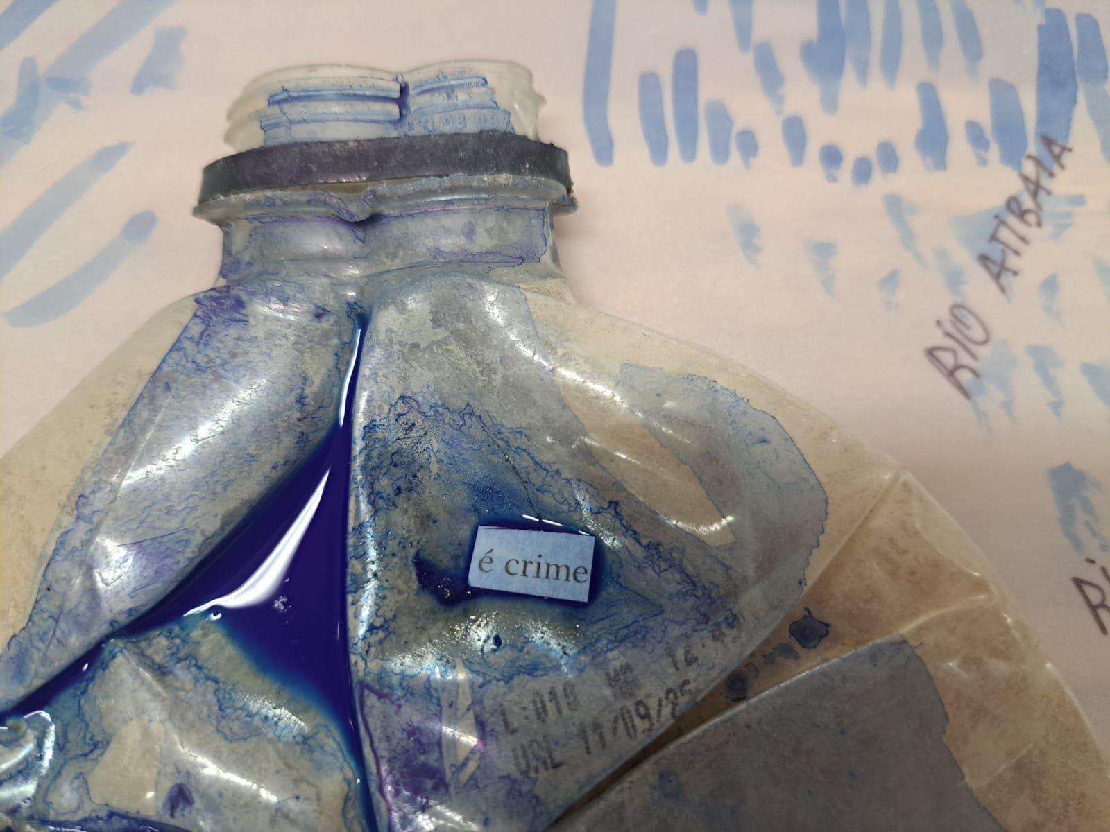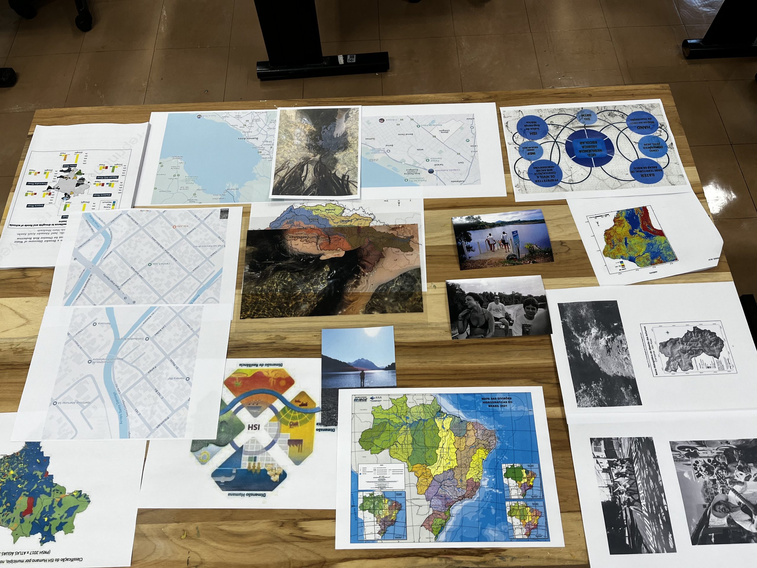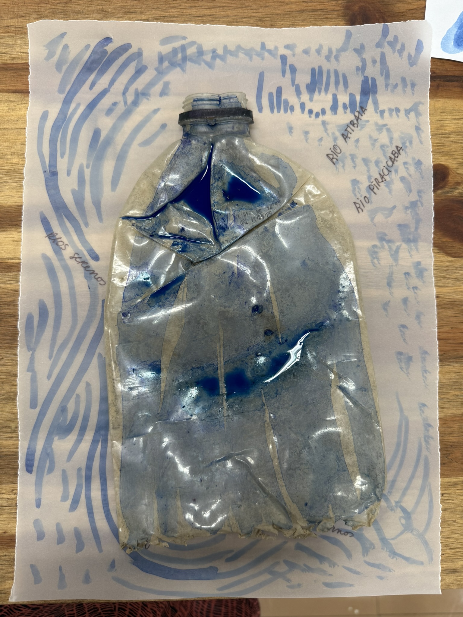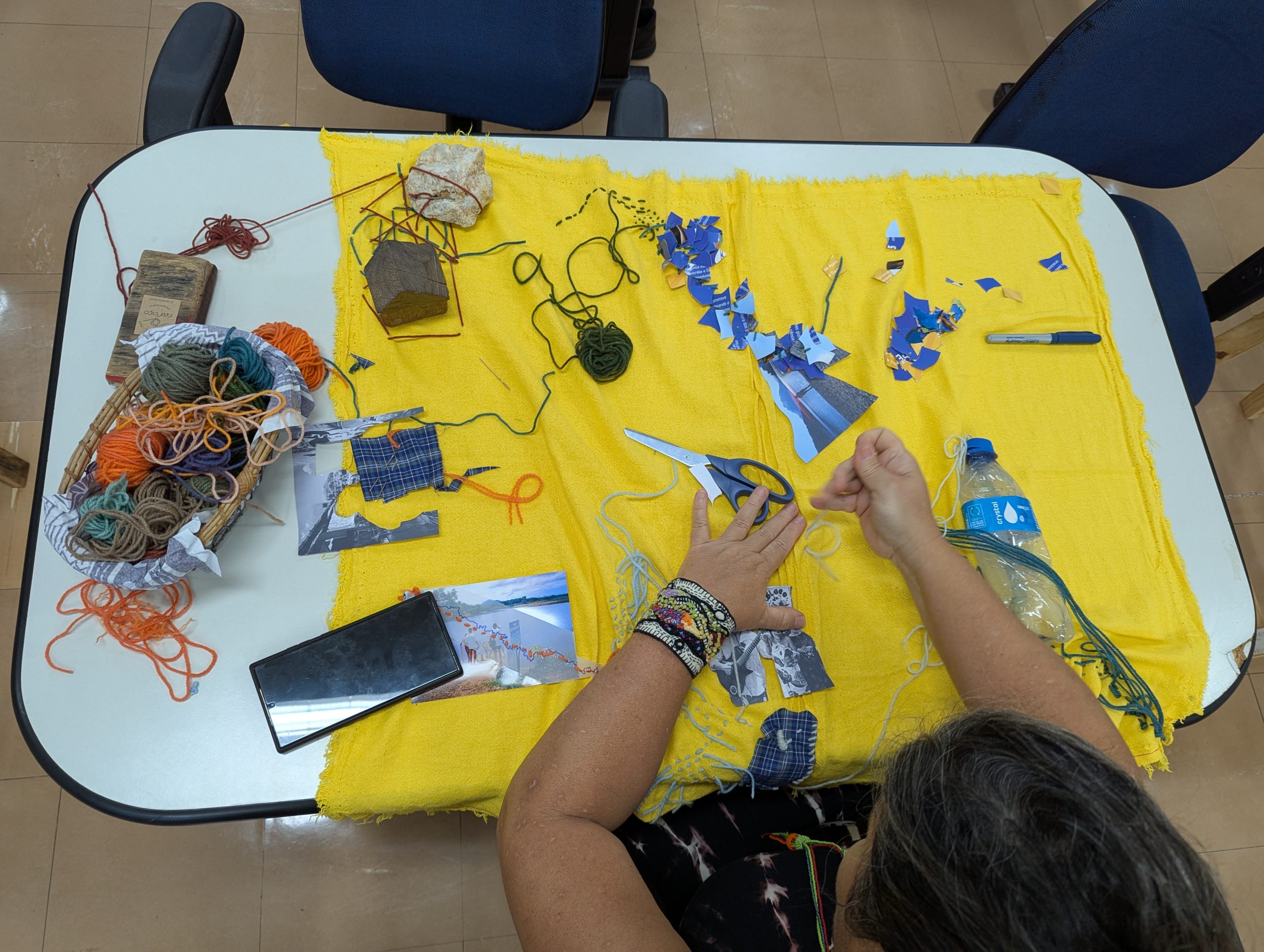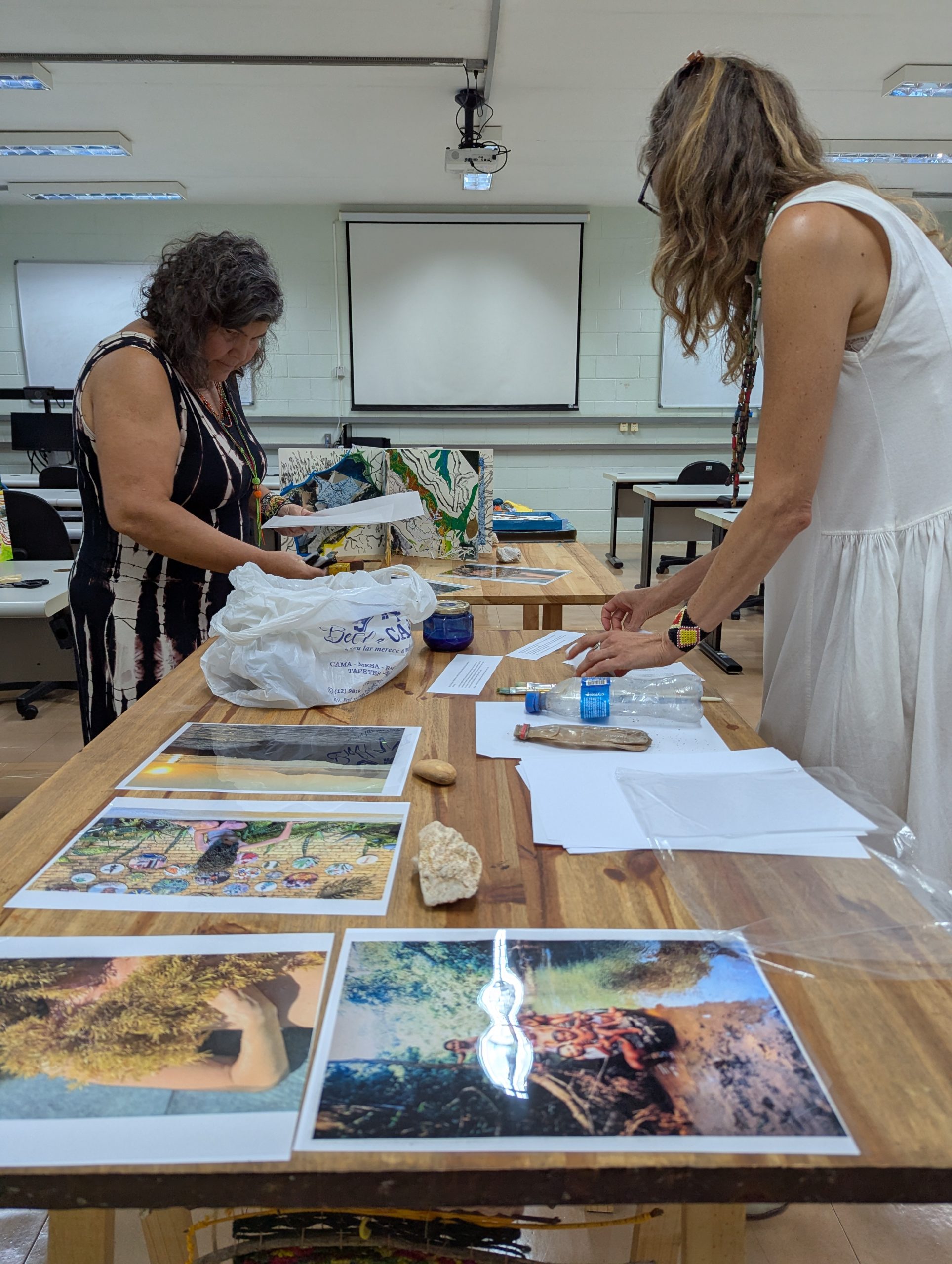 Como criar alianças com as águas em processos de pesquisa e criação artística? Como tornar as águas companhias efetivas de pensamento e modos de existir dentro da universidade? A primeira “Mesa de trabalho com as águas”, que o grupo multiTÃO realizou em 2025, mais precisamente no dia 24 de março, movimentou essas perguntas. As mesas de trabalho já haviam sido feitas antes pelo grupo com as nuvens, os sapos, os pássaros, os vírus, as plantas… e, desta vez, nos encontramos com as águas. O encontro aconteceu online e presencial no Labjor-Unicamp. As artistas Mariana Vilela e Valéria Scornanienchi trouxeram propostas e materiais para iniciarmos os movimentos de coleta e experimentação. Mariana pediu que trouxéssemos uma garrafa pet coletada da rua – ressaltando que era muito importante que esta fosse realmente coletada nas ruas e que estivesse no chão -, uma foto nossa com o mar ou rio para fazer intervenções e que pesquisássemos os rios que estavam perto de nossas casas. Já Valéria trouxe uma proposta de bordado coletivo que ela já tem experimentado em vários outros espaços e nos convidou a bordar um manto das águas. Além das garrafas, fotografias impressas em acetato e papel, linhas, agulhas e tecido, também vieram para a mesa: mapas e diagramas de pesquisas realizadas no projeto INCT Onseadapta e imagens de divindades das águas, que Marcela Perpétuo trouxe; contas de água, que Fernando Camargo levou; o livro objeto Ri(s)o <https://climacom.mudancasclimaticas.net.br/livro-riso/>, levado por Susana Dias; criações com madeiras coletadas na praia da Vila Joanes pelo artista Lupa Jacob, trazidas por Valéria Scornaienchi. Nas suas casas, quem participou online, também trouxe outras materialidades para a mesa. Durante uma tarde, o grupo lidou com esses materiais criando interseções entre eles, aprendendo a se relacionar com materiais hipercomplexos como o plástico, ensaiando pinturas, desenhos, bordados, performances que ativassem a força das águas. A mesa inundou a sala e deixou os corpos cheios de novas possibilidades: criar uma cartela de cores das águas, instaurar uma bacia hidrográfica fabulada que reúna diferentes corpos d’água, trazer plantas para a mesa e compor com elas, trabalhar com as águas em contextos situados, realizar a mesa à beira d’água, criando conexões com rios mais próximos da universidade… Sentimos como as águas nos convocam para outros encontros…