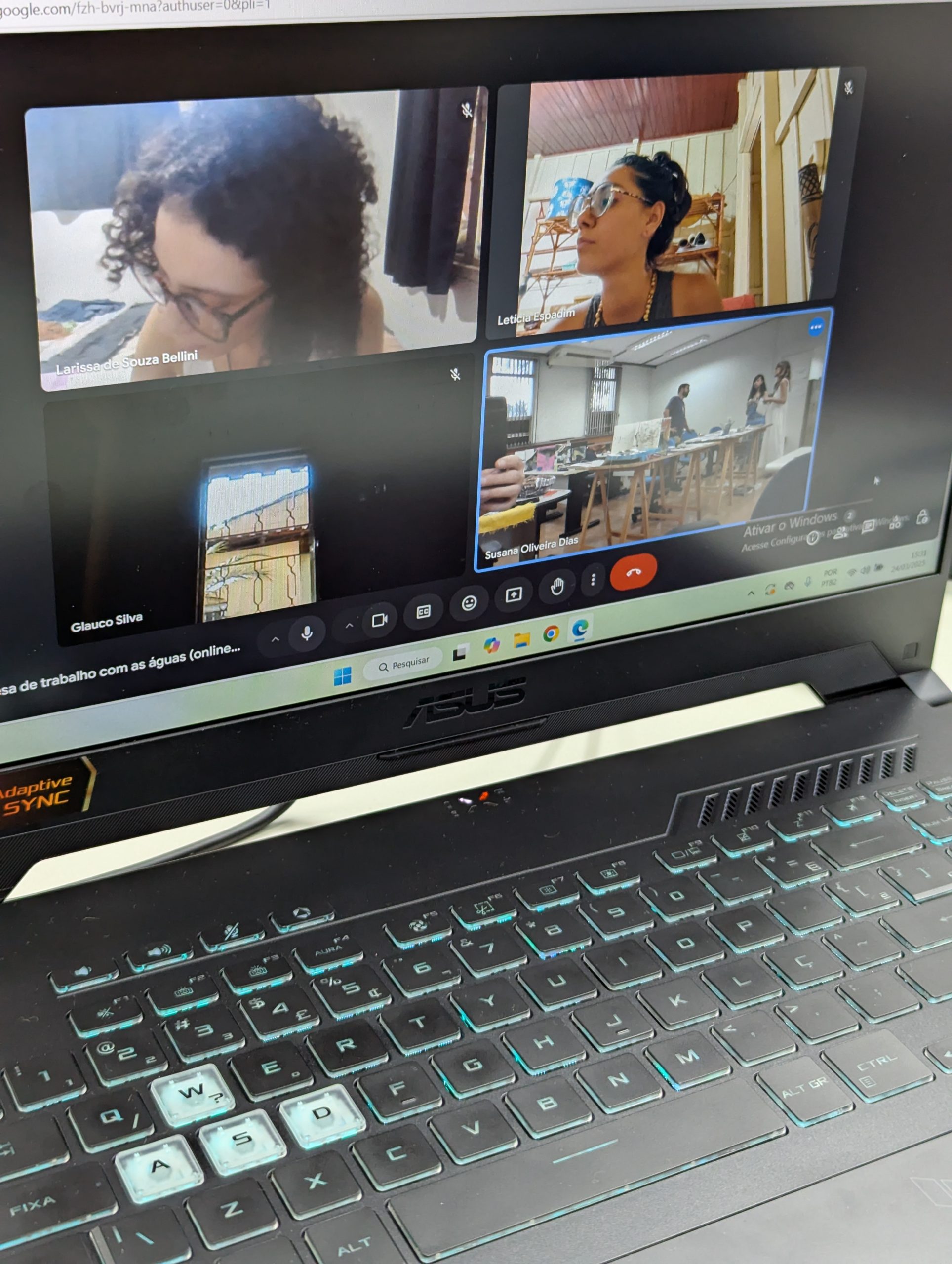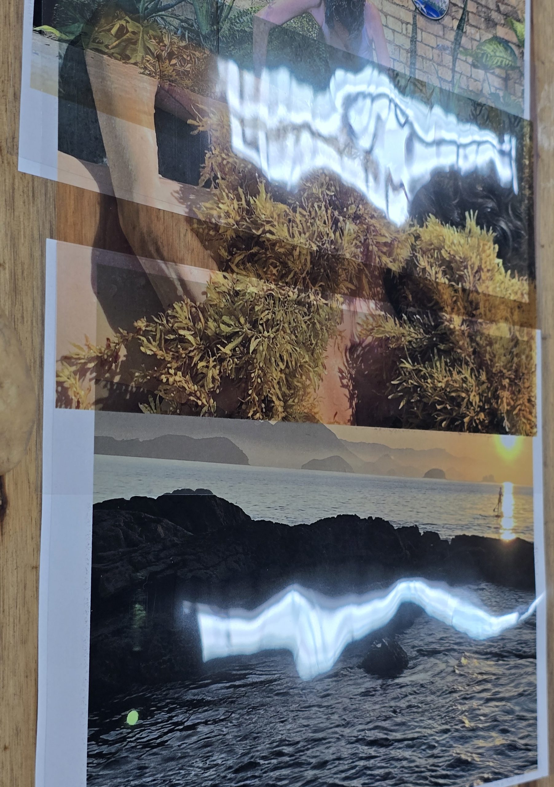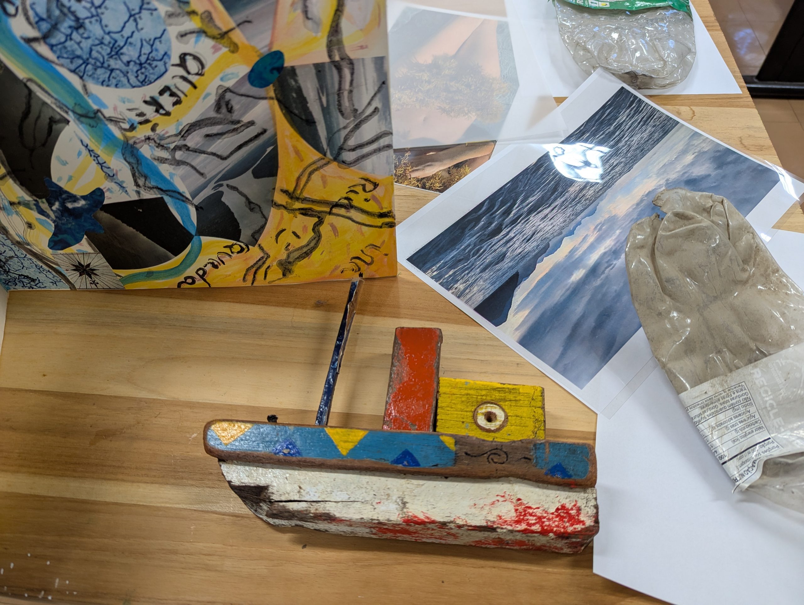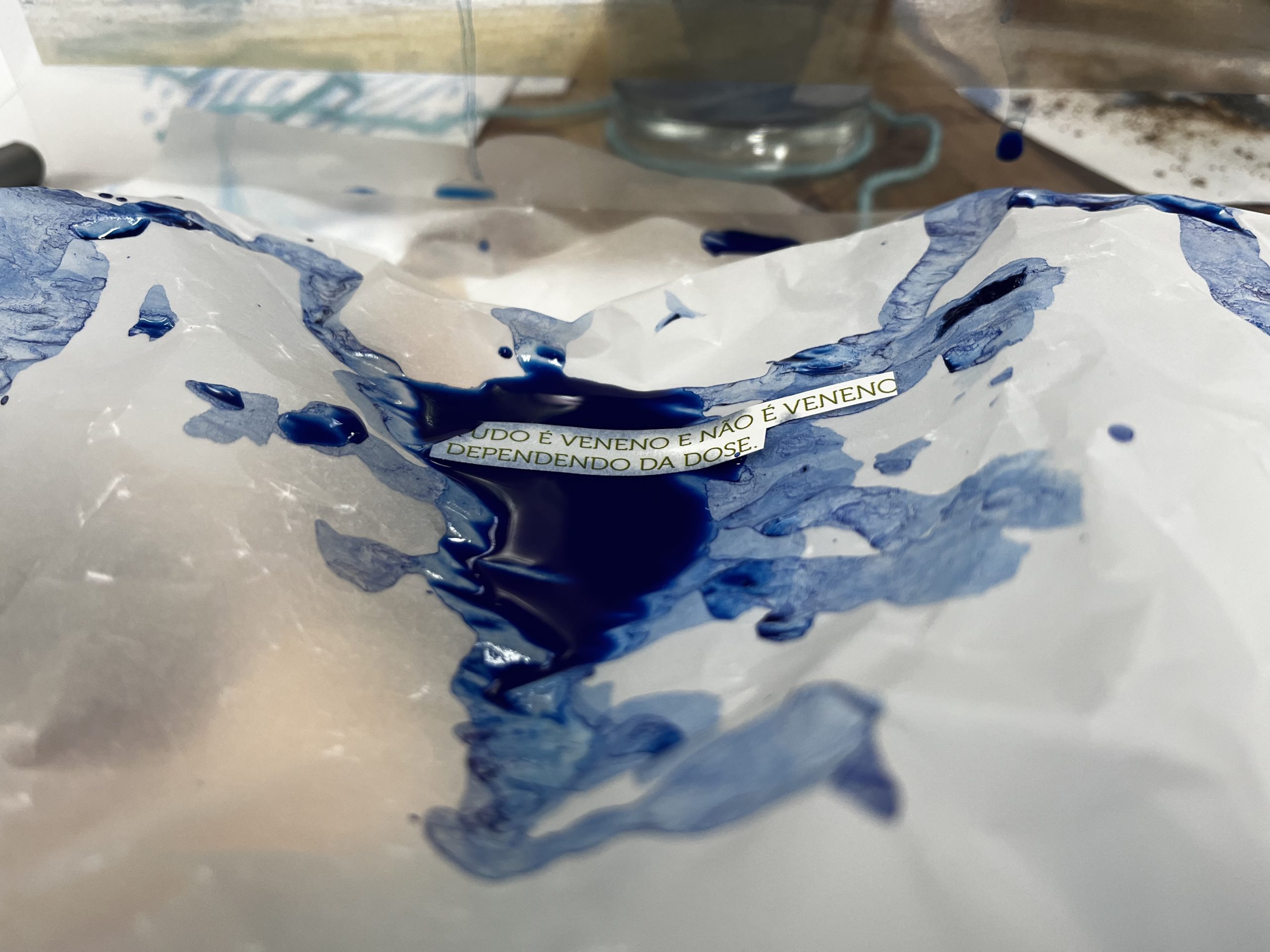 Como criar alianças com as águas em processos de pesquisa e criação artística? Como tornar as águas companhias efetivas de pensamento e modos de existir dentro da universidade? A primeira “Mesa de trabalho com as águas”, que o grupo multiTÃO realizou em 2025, mais precisamente no dia 24 de março, movimentou essas perguntas. As mesas de trabalho já haviam sido feitas antes pelo grupo com as nuvens, os sapos, os pássaros, os vírus, as plantas… e, desta vez, nos encontramos com as águas. O encontro aconteceu online e presencial no Labjor-Unicamp. As artistas Mariana Vilela e Valéria Scornanienchi trouxeram propostas e materiais para iniciarmos os movimentos de coleta e experimentação. Mariana pediu que trouxéssemos uma garrafa pet coletada da rua – ressaltando que era muito importante que esta fosse realmente coletada nas ruas e que estivesse no chão -, uma foto nossa com o mar ou rio para fazer intervenções e que pesquisássemos os rios que estavam perto de nossas casas. Já Valéria trouxe uma proposta de bordado coletivo que ela já tem experimentado em vários outros espaços e nos convidou a bordar um manto das águas. Além das garrafas, fotografias impressas em acetato e papel, linhas, agulhas e tecido, também vieram para a mesa: mapas e diagramas de pesquisas realizadas no projeto INCT Onseadapta e imagens de divindades das águas, que Marcela Perpétuo trouxe; contas de água, que Fernando Camargo levou; o livro objeto Ri(s)o <https://climacom.mudancasclimaticas.net.br/livro-riso/>, levado por Susana Dias; criações com madeiras coletadas na praia da Vila Joanes pelo artista Lupa Jacob, trazidas por Valéria Scornaienchi. Nas suas casas, quem participou online, também trouxe outras materialidades para a mesa. Durante uma tarde, o grupo lidou com esses materiais criando interseções entre eles, aprendendo a se relacionar com materiais hipercomplexos como o plástico, ensaiando pinturas, desenhos, bordados, performances que ativassem a força das águas. A mesa inundou a sala e deixou os corpos cheios de novas possibilidades: criar uma cartela de cores das águas, instaurar uma bacia hidrográfica fabulada que reúna diferentes corpos d’água, trazer plantas para a mesa e compor com elas, trabalhar com as águas em contextos situados, realizar a mesa à beira d’água, criando conexões com rios mais próximos da universidade… Sentimos como as águas nos convocam para outros encontros…